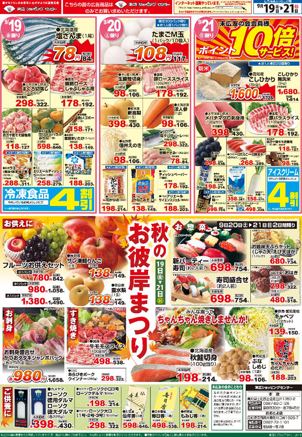 今日のチラシは「秋のお彼岸祭り。フルーツお供えセット780円」