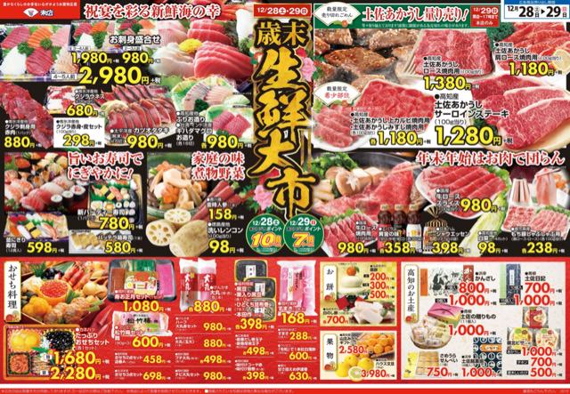 元日:定休日 2日:9:00〜18:00 3日:9:00〜18:00 4日より平常営業 広報 この記事が気に入ったら いいね または フォローしてね! Follow @suehiloya Follow Me よかったらシェアしてね! URLをコピーしました! URLをコピーしました! 12月22日から12月24日のチラシは「Merry Christmas!食卓を盛り上げる主役のチキン!四万十鶏ローストレッグ600円」 高知家の〇〇に掲載されました 関連記事 9月5日~9月11日のチラシは「秋のうまかもん祭り 本マグロ刺身用 755円」 2025年9月4日 8月29日~9月4日のチラシは「家計応援! 総力祭 トラウトサーモン 215円」 2025年8月28日 8月22日~8月28日のチラシは「初秋の味わい・秋の新商品 生さんま1尾 215円」 2025年8月21日 8月15日~8月21日のチラシは「夏のスタミナ飯特集 北海道産 無添加ほっけ開き 410円」 2025年8月14日 仕出しのメニューを更新しました。(2025年8月) 2025年8月8日 8月8日~8月14日のチラシは「お盆のごちそう 海鮮BBQセット 863円」 2025年8月7日 8月1日~8月7日のチラシは「家計応援総力祭 バナメイエビメガパック 1,058円」 2025年7月31日 7月25日~7月31日のチラシは「お庭でBBQ・おうちでごちそう 牛肩ロースステーキ(100g) 269円」 2025年7月24日