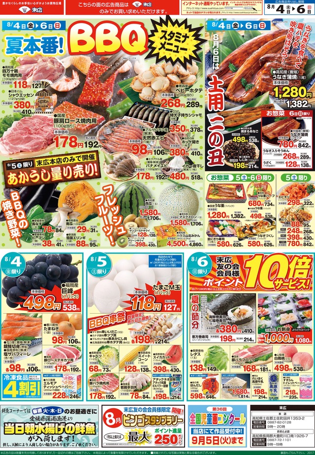 8月4日から8月6日のチラシは「夏本番!BBQスタミナメニュー。四万十鶏モモ焼肉用118円」