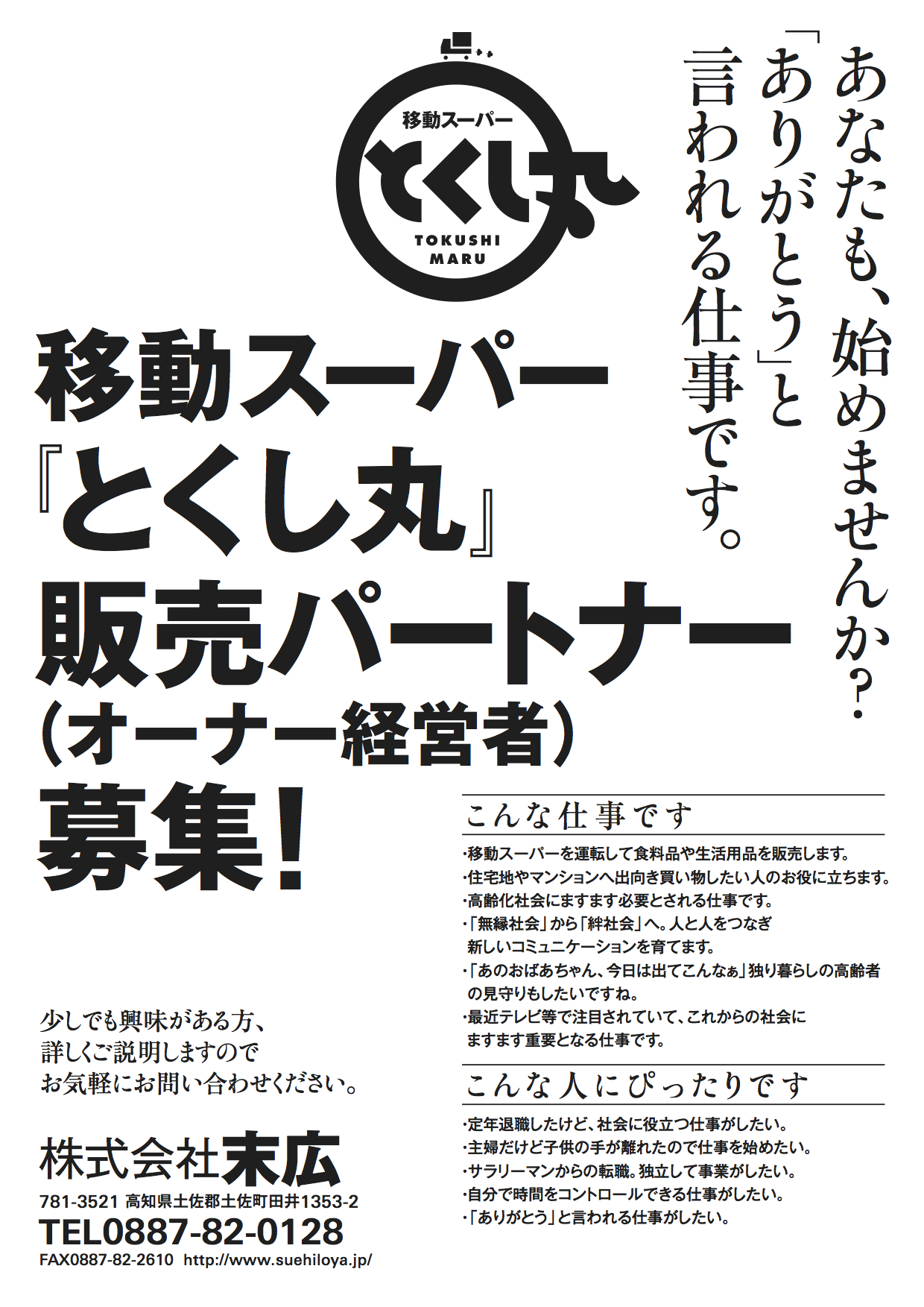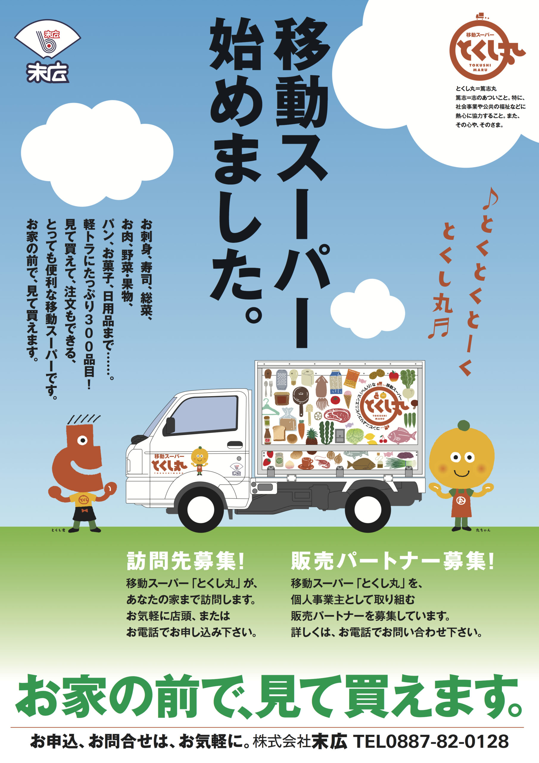 2015年9月1日を開業予定として、株式会社末広は移動スーパー「とくし丸」を始めます。
