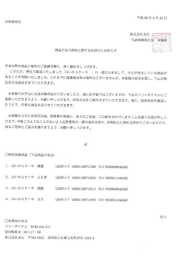 お客様のお手元に当該対象商品がございましたら、誠にお手数ではございますが、下記のフリーダイヤルにご連絡いただきますよう、お願い申し上げます。回収方法をご案内させていただきます。後日、回収商品を確認したうえで、代替え商品を送らせていただきます。