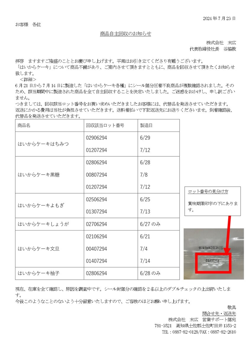 6月21日から7月14日に製造した「はいからケーキ各種」にシール部分圧着不良商品が複数確認されました。そのため、該当期間中に製造された商品を全て自主回収することを決定いたしました。ご迷惑をおかけし、申し訳ございません。
