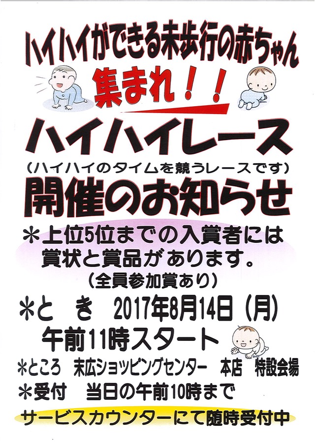 ※出場資格は、ハイハイができる未歩行の赤ちゃんに限ります。 - 受付サービスカウンターで当日の午前10時まで随時受付しております。webからも前日まで受付しています。