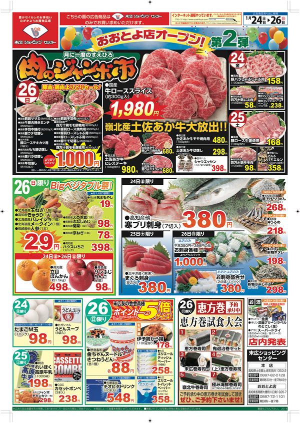 今日のチラシは「おおとよ店オープン第2弾。肉のジャンボ市。土佐あかうしヒレステーキ980円」