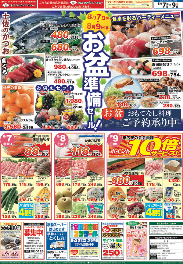 今日のチラシは「お盆準備セール。魚屋さんおすすめ土佐盛480円」