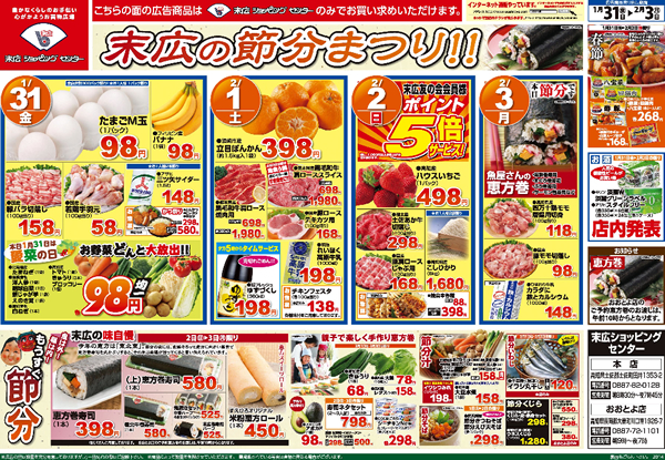 今日のチラシは「末広の節分まつり。たまごM玉98円」