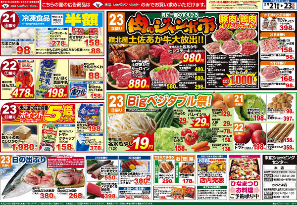 今日のチラシは「肉のジャンボ市。土佐あか牛ヒレステーキ980円」