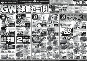今日のチラシは「GWを愉しく!こどもの日おめでとうセール。国産牛焼肉セット2,980円」