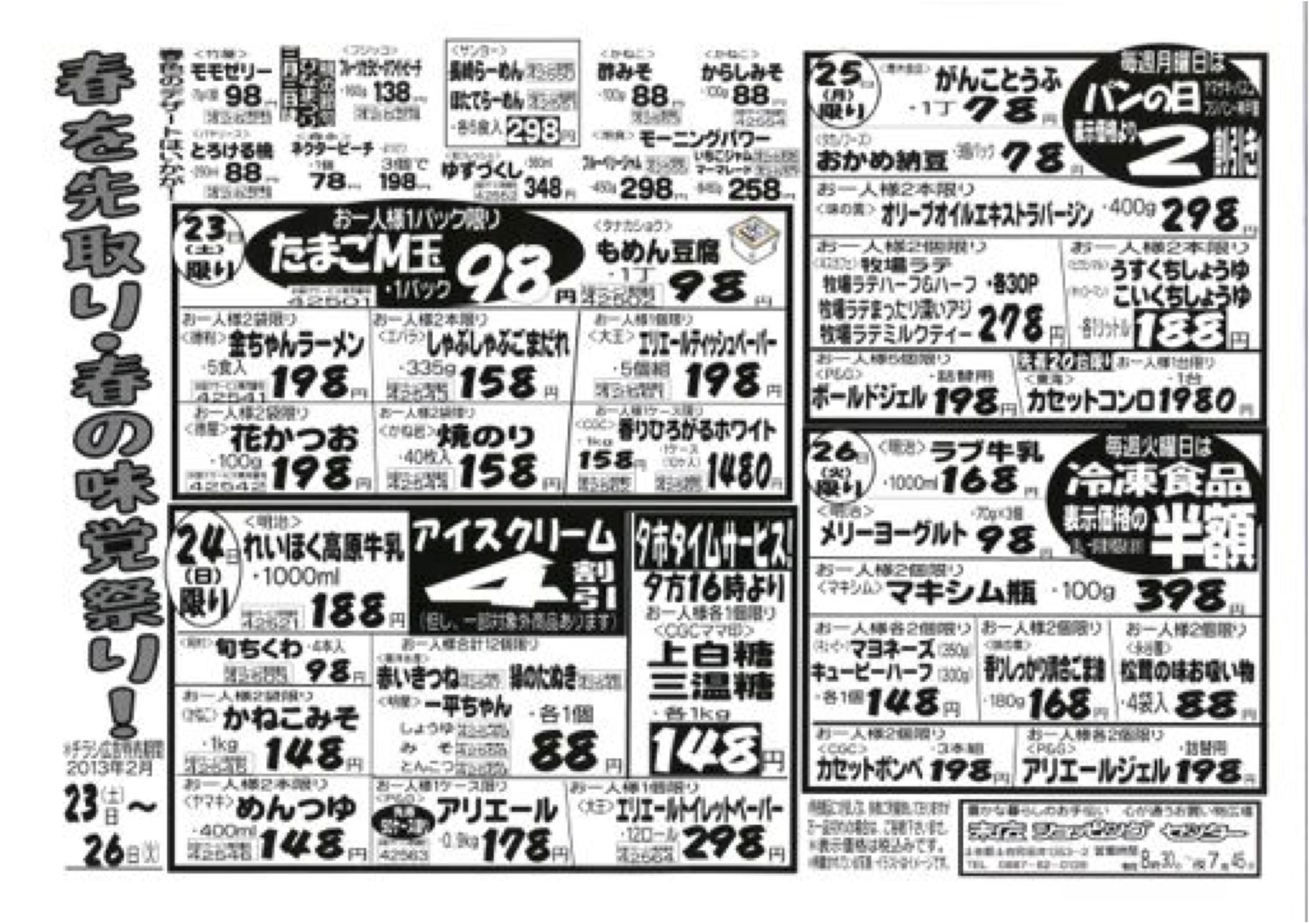 今日のチラシは「春を先取り!春野味覚祭り!モモゼリー70g×3個98円」