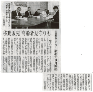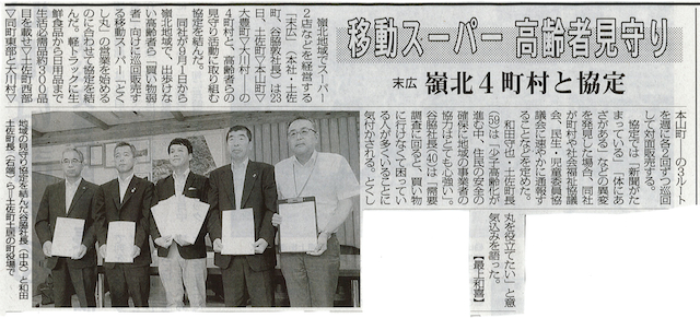 株式会社末広は、2015年9月より土佐町・本山町・大豊町・大川村の四町村で移動スーパー「とくし丸」事業は始めます。移動スーパーの事業を通じて、地域の見守り活動に関する協定を嶺北四町村と締結しました。 メディア掲載 この記事が気に入ったら いいね または フォローしてね! Follow @suehiloya Follow Me よかったらシェアしてね! URLをコピーしました! URLをコピーしました! 高知新聞2015年7月24日付朝刊に、嶺北地域四町村との見守り協定の締結が掲載されました。 ほっとこうち8月号に、末広のおむすびサンドが掲載されました! 関連記事 9月5日~9月11日のチラシは「秋のうまかもん祭り 本マグロ刺身用 755円」 2025年9月4日 8月29日~9月4日のチラシは「家計応援! 総力祭 トラウトサーモン 215円」 2025年8月28日 8月22日~8月28日のチラシは「初秋の味わい・秋の新商品 生さんま1尾 215円」 2025年8月21日 8月15日~8月21日のチラシは「夏のスタミナ飯特集 北海道産 無添加ほっけ開き 410円」 2025年8月14日 仕出しのメニューを更新しました。(2025年8月) 2025年8月8日 8月8日~8月14日のチラシは「お盆のごちそう 海鮮BBQセット 863円」 2025年8月7日 8月1日~8月7日のチラシは「家計応援総力祭 バナメイエビメガパック 1,058円」 2025年7月31日 7月25日~7月31日のチラシは「お庭でBBQ・おうちでごちそう 牛肩ロースステーキ(100g) 269円」 2025年7月24日
