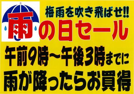 6月1日より6月30日まで雨の日セールを行います。 午前9時から午後3時までに雨が降ったら、店内のいたるところで お買い得の商品が出ています。 このPOPを目印に、ゆっくりとお買い回り下さい。 広報 この記事が気に入ったら いいね または フォローしてね! Follow @suehiloya Follow Me よかったらシェアしてね! URLをコピーしました! URLをコピーしました! 初夏の味覚を味わう。生かつおタタキ398円 中華メニュー総選挙。麻婆豆腐の素128円 関連記事 10月17日~10月23日のチラシは「秋の土用スタミナメニュー 生さんま 626円」 2025年10月16日 高知新聞で「田舎寿司せっと」が紹介されました! 2025年10月16日 9月5日~9月11日のチラシは「秋のうまかもん祭り 本マグロ刺身用 755円」 2025年9月4日 8月29日~9月4日のチラシは「家計応援! 総力祭 トラウトサーモン 215円」 2025年8月28日 8月22日~8月28日のチラシは「初秋の味わい・秋の新商品 生さんま1尾 215円」 2025年8月21日 8月15日~8月21日のチラシは「夏のスタミナ飯特集 北海道産 無添加ほっけ開き 410円」 2025年8月14日 仕出しのメニューを更新しました。(2025年8月) 2025年8月8日 8月8日~8月14日のチラシは「お盆のごちそう 海鮮BBQセット 863円」 2025年8月7日