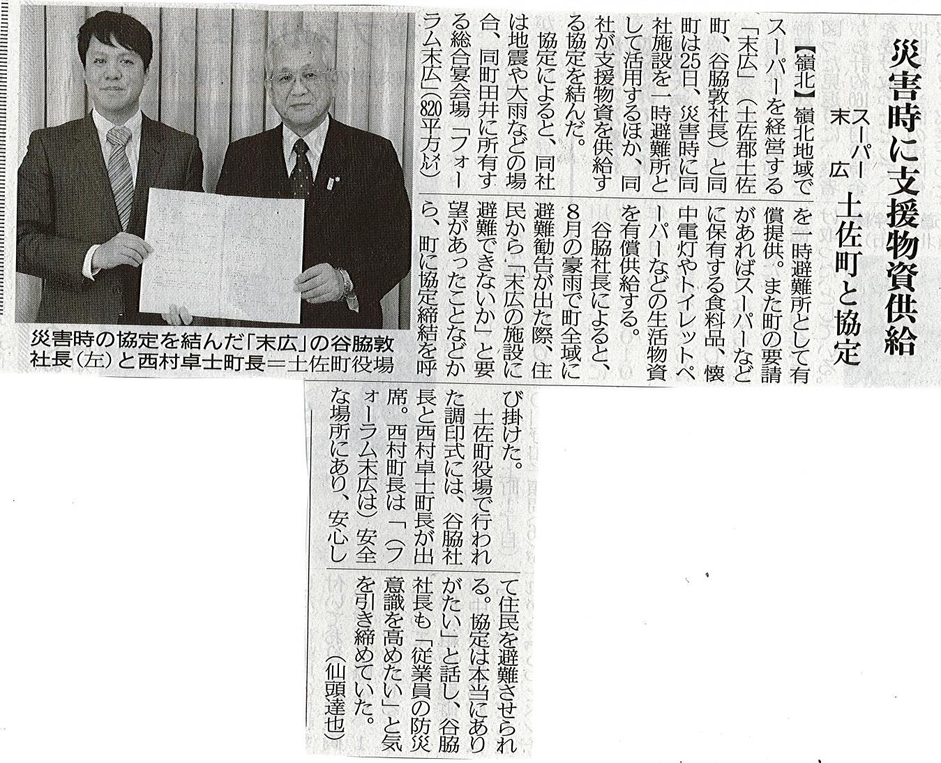 高知新聞2014年12月27日付、朝刊に 土佐町と災害時に支援物資供給の協定を結んだ記事が掲載されました。 メディア掲載 この記事が気に入ったら いいね または フォローしてね! Follow @suehiloya Follow Me よかったらシェアしてね! URLをコピーしました! URLをコピーしました! 高知新聞に、ここだけ大福が掲載されました! 今日のチラシは「大歳の市。にぎり寿司(32貫入)1,780円」 関連記事 10月17日~10月23日のチラシは「秋の土用スタミナメニュー 生さんま 626円」 2025年10月16日 高知新聞で「田舎寿司せっと」が紹介されました! 2025年10月16日 9月5日~9月11日のチラシは「秋のうまかもん祭り 本マグロ刺身用 755円」 2025年9月4日 8月29日~9月4日のチラシは「家計応援! 総力祭 トラウトサーモン 215円」 2025年8月28日 8月22日~8月28日のチラシは「初秋の味わい・秋の新商品 生さんま1尾 215円」 2025年8月21日 8月15日~8月21日のチラシは「夏のスタミナ飯特集 北海道産 無添加ほっけ開き 410円」 2025年8月14日 仕出しのメニューを更新しました。(2025年8月) 2025年8月8日 8月8日~8月14日のチラシは「お盆のごちそう 海鮮BBQセット 863円」 2025年8月7日