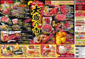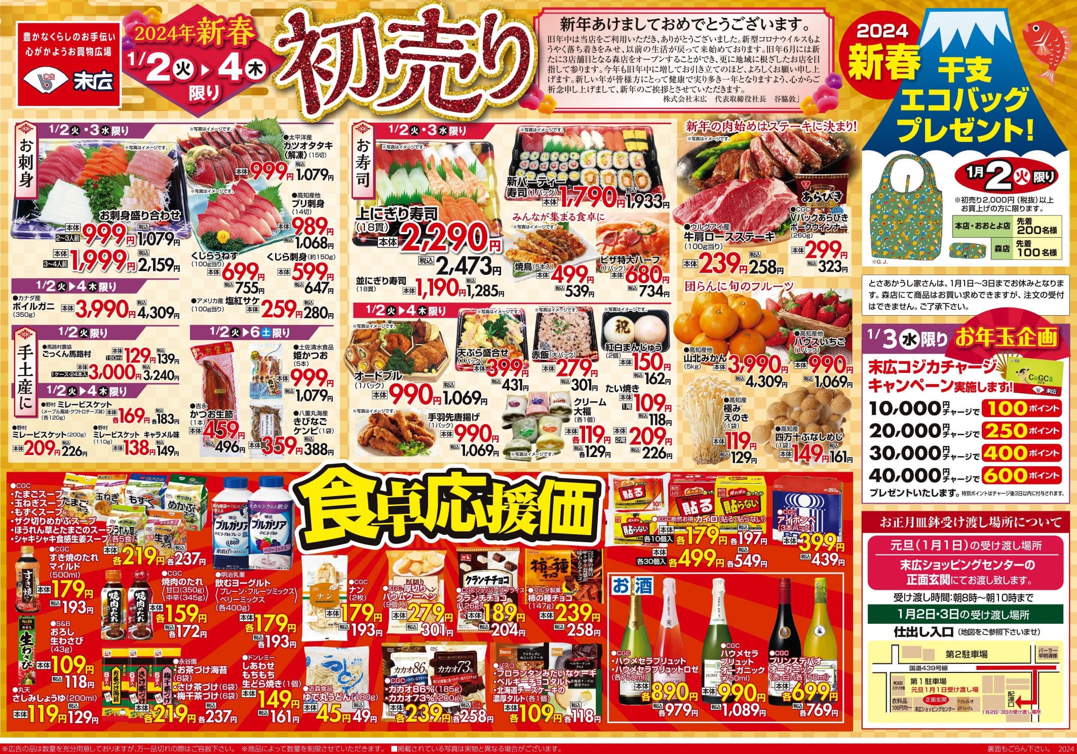 【末広チラシ情報】ネットでチラシを確認できます。 1月2日~1月4日のチラシは「新春初売り お刺身盛り合わせ 1,079円」 詳細版PDFはこちら(1.5MB) チラシ情報 この記事が気に入ったら いいね または フォローしてね! Follow @suehiloya Follow Me よかったらシェアしてね! URLをコピーしました! URLをコピーしました! 12月29日~12月31日のチラシは「大歳の市 土佐あかうしロースすき焼き用 3,239円」 1月5日~1月11日のチラシは「春の七草 七草(1パック) 539円」 関連記事 9月5日~9月11日のチラシは「秋のうまかもん祭り 本マグロ刺身用 755円」 2025年9月4日 8月29日~9月4日のチラシは「家計応援! 総力祭 トラウトサーモン 215円」 2025年8月28日 8月22日~8月28日のチラシは「初秋の味わい・秋の新商品 生さんま1尾 215円」 2025年8月21日 8月15日~8月21日のチラシは「夏のスタミナ飯特集 北海道産 無添加ほっけ開き 410円」 2025年8月14日 仕出しのメニューを更新しました。(2025年8月) 2025年8月8日 8月8日~8月14日のチラシは「お盆のごちそう 海鮮BBQセット 863円」 2025年8月7日 8月1日~8月7日のチラシは「家計応援総力祭 バナメイエビメガパック 1,058円」 2025年7月31日 7月25日~7月31日のチラシは「お庭でBBQ・おうちでごちそう 牛肩ロースステーキ(100g) 269円」 2025年7月24日