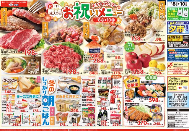 1月8日から1月10日のチラシは「祝1/11成人の日。おうちで簡単お祝いメニュー。徳用おでん288円」