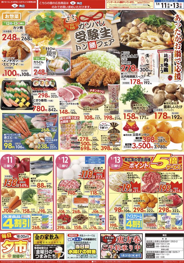 1月11日から1月13日のチラシは「ガンバレ受験生。トン勝フェア。豚ローステキカツ用148円」