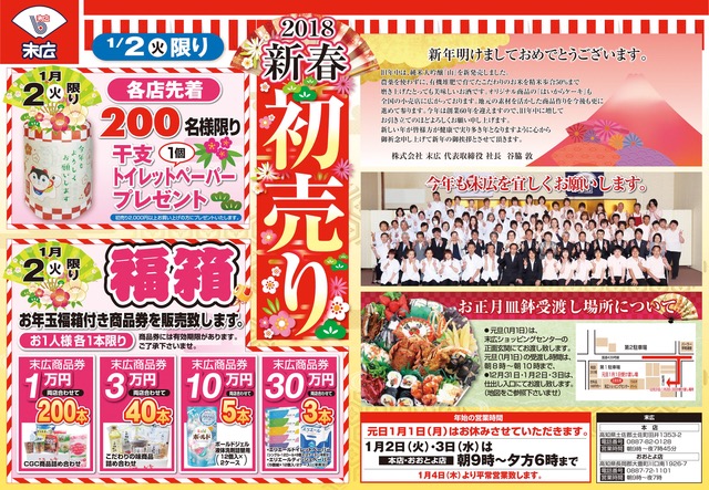 1月2日から1月3日のチラシは「2018新春初売り。お造り盛り合わせ2.980円」