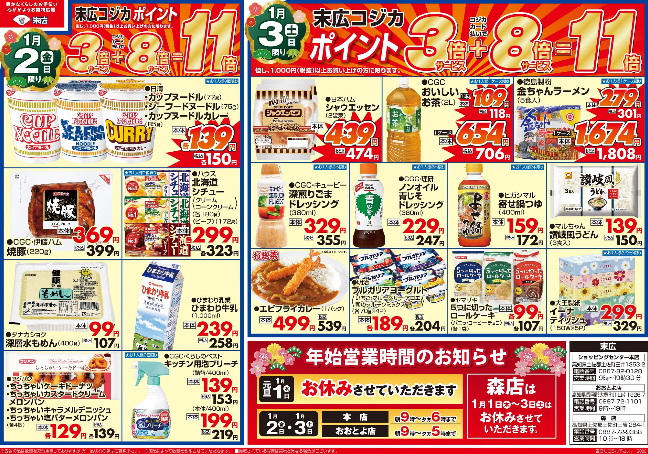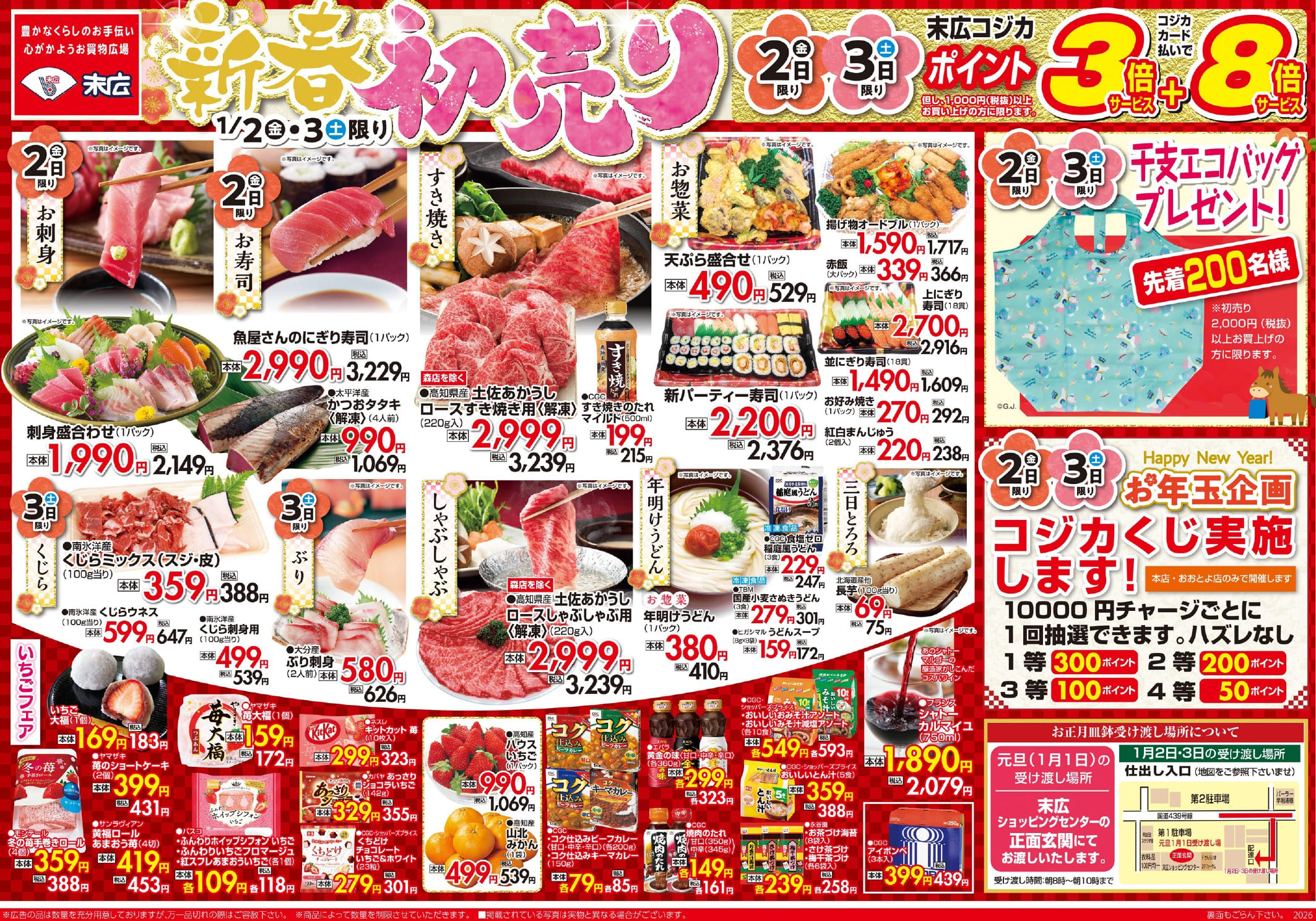 【末広チラシ情報】ネットでチラシを確認できます。 1月2日~1月3日のチラシは「新春初売り 刺身盛合わせ 2,149 円」 詳細版PDFはこちら(1.0MB) チラシ情報 この記事が気に入ったら いいね または フォローしてね! Follow @suehiloya Follow Me よかったらシェアしてね! URLをコピーしました! URLをコピーしました! 12月26日~12月31日のチラシは「大〆の感謝祭 本マグロ刺身用(中トロ) 961 円」 関連記事 12月26日~12月31日のチラシは「大〆の感謝祭 本マグロ刺身用(中トロ) 961 円」 2025年12月25日 12月19日~12月25日のチラシは「ファミリークリスマス 四万十産ローストレッグ 755 円」 2025年12月18日 高知新聞折り込み冊子「ミリカ」に掲載されました 2025年12月17日 12月12日~12月18日のチラシは「あったかおうち鍋 大分産ぶり切身 431 円」 2025年12月11日 12月5日~12月11日のチラシは「おうち忘年会 大分産ぶりしゃぶしゃぶ用 842 円」 2025年12月4日 11月28日~12月4日のチラシは「歳末大感謝祭! 牛肩ロースすき焼き用 323 円」 2025年11月27日 11月21日~11月27日のチラシは「ごち鍋まつり 生カキ(加熱用) 388 円」 2025年11月20日 2026年初春お正月おせち・皿鉢料理の予約受付開始いたしました。 2025年11月19日