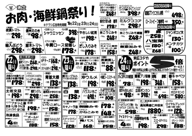 【末広チラシ情報】ネットでチラシを確認できます。 1月22日から1月24日のチラシは「!夜須トマト298円」 http://ow.ly/C3M050Dd9S1 pdf(256kB) チラシ情報 この記事が気に入ったら いいね または フォローしてね! Follow @suehiloya Follow Me よかったらシェアしてね! URLをコピーしました! URLをコピーしました! 2021年2月12日(金)フォーラム末広にて、映画「弁当の日」を上映いたします。 1月29日から2月4日のチラシは「こじゃんと旨い!高知を食べよう!土佐あかうしサーロインステーキ1,280円」 関連記事 10月31日~11月6日のチラシは「月初めの市 バナメイエビ 215円」 2025年10月30日 株式会社末広のHPがリニューアルしました 2025年10月30日 10月24日~10月30日のチラシは「おうちでハロウィンしよ サーモン刺身用 388円」 2025年10月23日 10月17日~10月23日のチラシは「秋の土用スタミナメニュー 生さんま 626円」 2025年10月16日 高知新聞で「田舎寿司せっと」が紹介されました! 2025年10月16日 9月5日~9月11日のチラシは「秋のうまかもん祭り 本マグロ刺身用 755円」 2025年9月4日 8月29日~9月4日のチラシは「家計応援! 総力祭 トラウトサーモン 215円」 2025年8月28日 8月22日~8月28日のチラシは「初秋の味わい・秋の新商品 生さんま1尾 215円」 2025年8月21日
