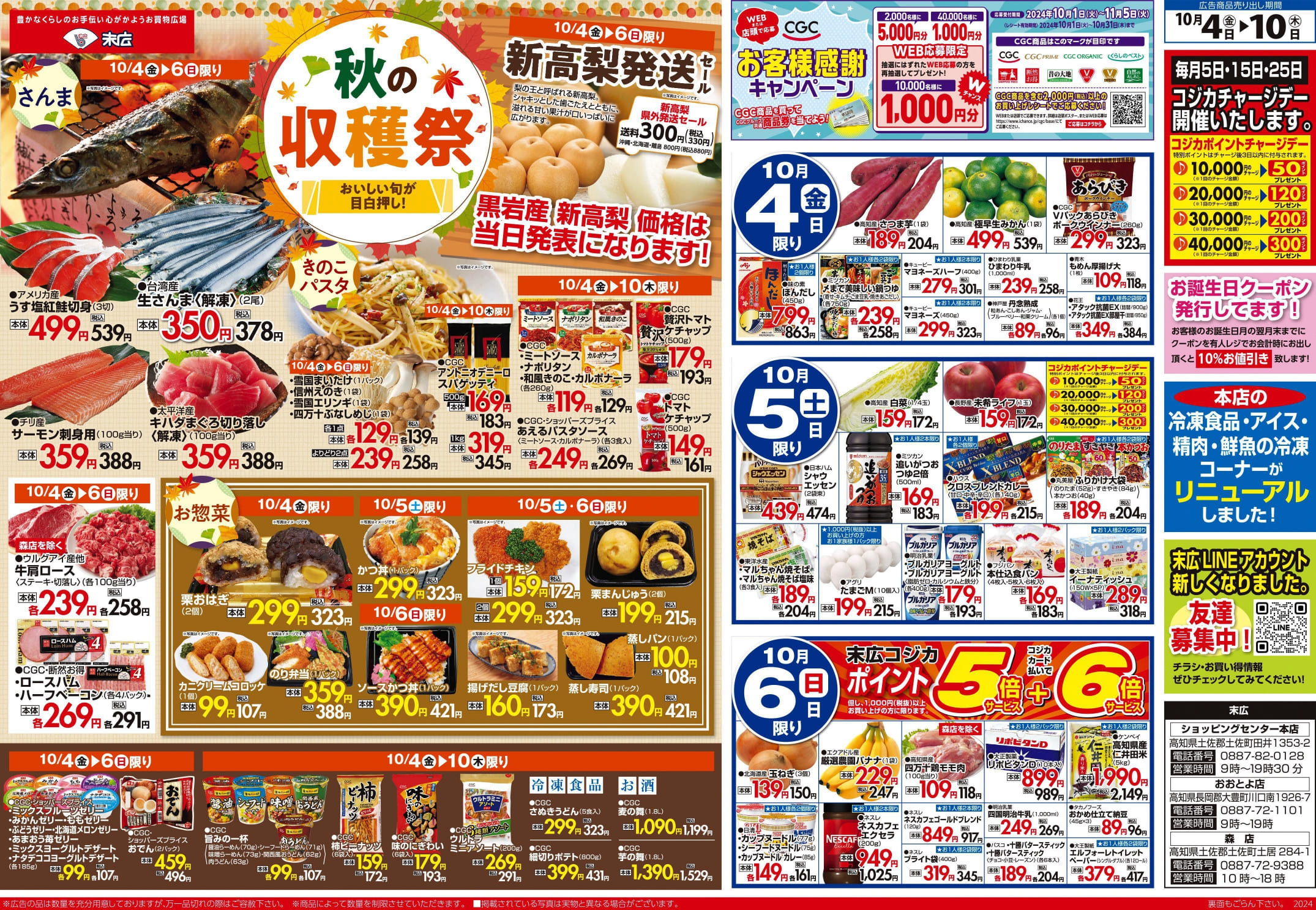 【末広チラシ情報】ネットでチラシを確認できます。 10月4日~10月10日のチラシは「秋の収穫祭 生さんま<解凍> 378円」 詳細版PDFはこちら(1.6MB) チラシ情報 この記事が気に入ったら いいね または フォローしてね! Follow @suehiloya Follow Me よかったらシェアしてね! URLをコピーしました! URLをコピーしました! 価格改定のお知らせ【予告】 【会員情報統合のお知らせ】 関連記事 9月5日~9月11日のチラシは「秋のうまかもん祭り 本マグロ刺身用 755円」 2025年9月4日 8月29日~9月4日のチラシは「家計応援! 総力祭 トラウトサーモン 215円」 2025年8月28日 8月22日~8月28日のチラシは「初秋の味わい・秋の新商品 生さんま1尾 215円」 2025年8月21日 8月15日~8月21日のチラシは「夏のスタミナ飯特集 北海道産 無添加ほっけ開き 410円」 2025年8月14日 仕出しのメニューを更新しました。(2025年8月) 2025年8月8日 8月8日~8月14日のチラシは「お盆のごちそう 海鮮BBQセット 863円」 2025年8月7日 8月1日~8月7日のチラシは「家計応援総力祭 バナメイエビメガパック 1,058円」 2025年7月31日 7月25日~7月31日のチラシは「お庭でBBQ・おうちでごちそう 牛肩ロースステーキ(100g) 269円」 2025年7月24日