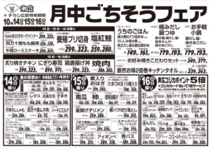 10月14日から10月16日のチラシは「月中ごちそうフェア。養殖ブリ切身323円」