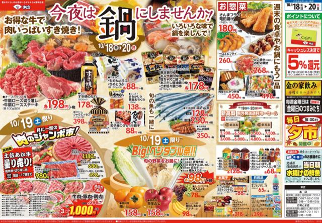 10月18日から10月20日のチラシは「今夜は鍋にしませんか。お得な牛で肉いっぱいすき焼き!牛肩ロース切り落とし198円」