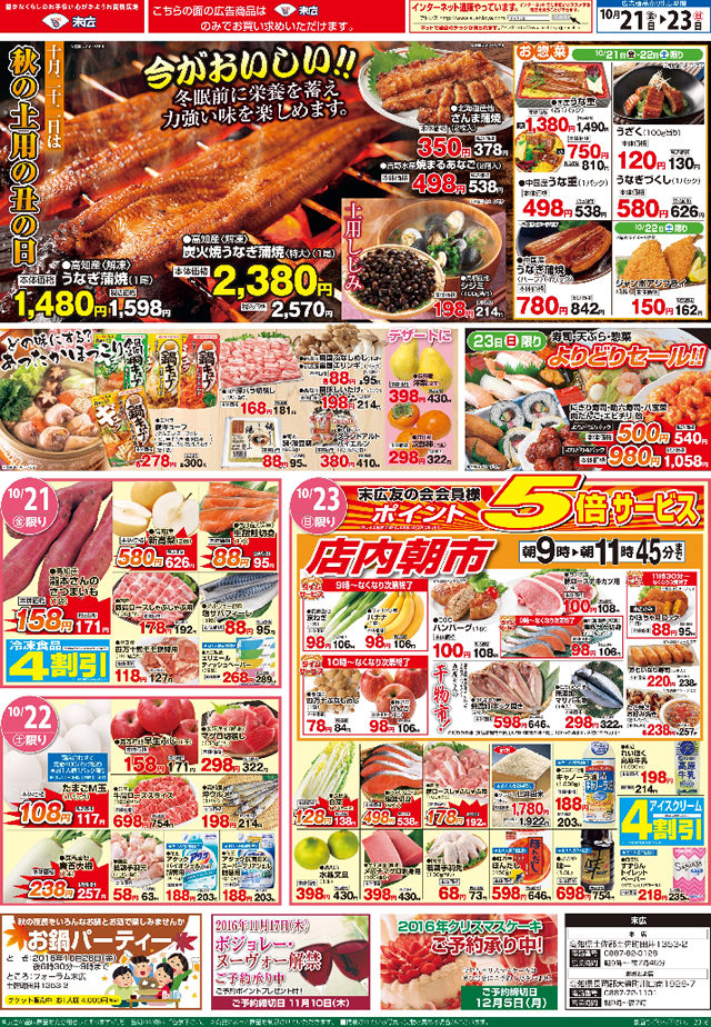10月21日から10月23日のチラシは「10月22日は秋の土用の丑の日。高知産うなぎ蒲焼き1,480円」