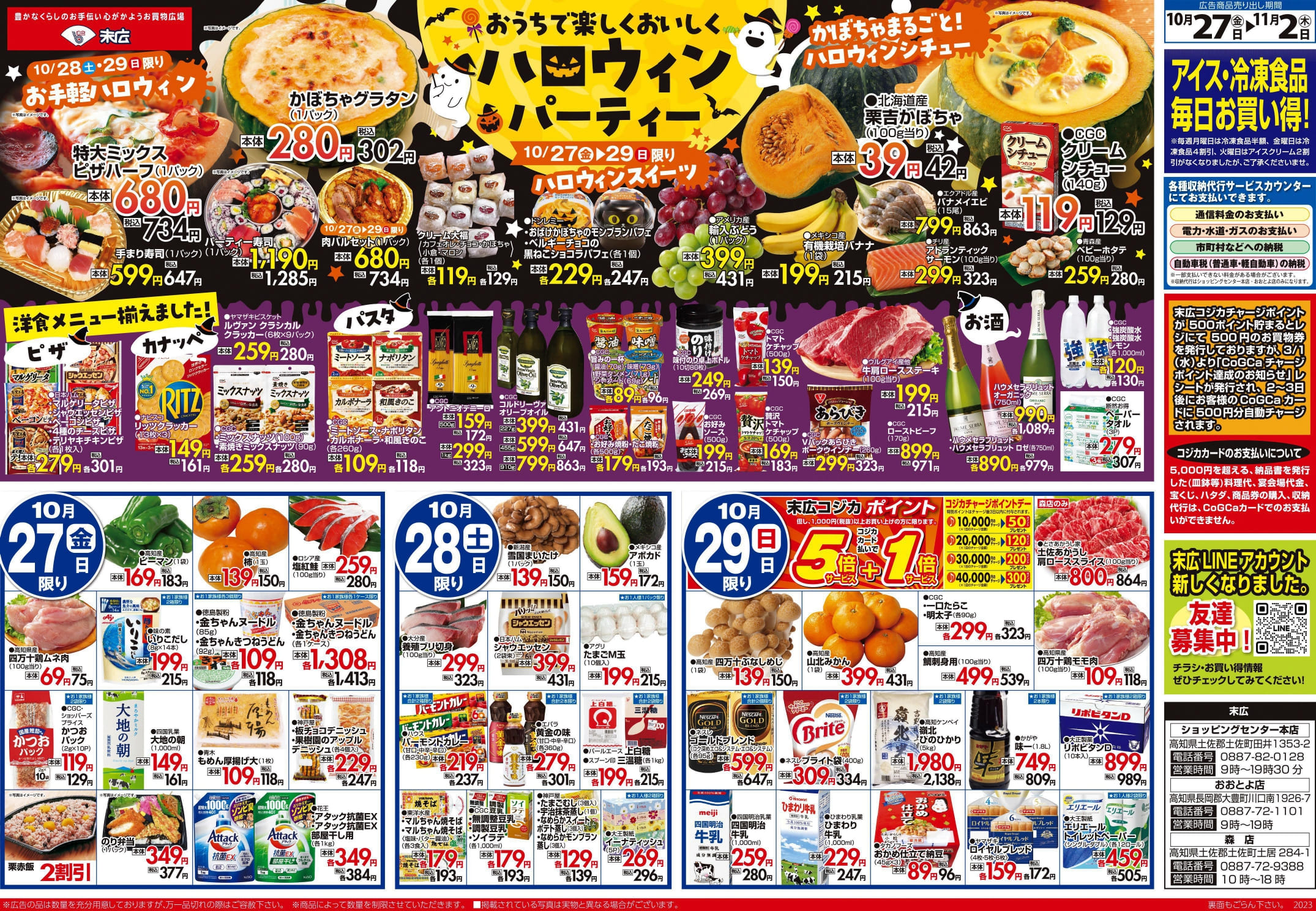 【末広チラシ情報】ネットでチラシを確認できます。 10月27日~11月2日のチラシは「お手軽ハロウィン かぼちゃグラタン 302円」 詳細版PDFはこちら(1.5MB) チラシ情報 この記事が気に入ったら いいね または フォローしてね! Follow @suehiloya Follow Me よかったらシェアしてね! URLをコピーしました! URLをコピーしました! 10月20日~10月26日のチラシは「お肉のジャンボ市! よりどり3パック 1080円」 11月3日~11月9日のチラシは「月初めの市 四万十鶏もも鍋用 172円」 関連記事 9月5日~9月11日のチラシは「秋のうまかもん祭り 本マグロ刺身用 755円」 2025年9月4日 8月29日~9月4日のチラシは「家計応援! 総力祭 トラウトサーモン 215円」 2025年8月28日 8月22日~8月28日のチラシは「初秋の味わい・秋の新商品 生さんま1尾 215円」 2025年8月21日 8月15日~8月21日のチラシは「夏のスタミナ飯特集 北海道産 無添加ほっけ開き 410円」 2025年8月14日 仕出しのメニューを更新しました。(2025年8月) 2025年8月8日 8月8日~8月14日のチラシは「お盆のごちそう 海鮮BBQセット 863円」 2025年8月7日 8月1日~8月7日のチラシは「家計応援総力祭 バナメイエビメガパック 1,058円」 2025年7月31日 7月25日~7月31日のチラシは「お庭でBBQ・おうちでごちそう 牛肩ロースステーキ(100g) 269円」 2025年7月24日