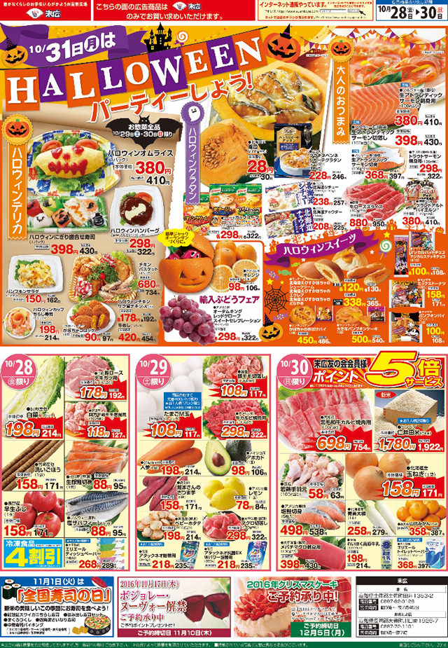 10月28日から10月30日のチラシは「10月31日はHALLOWEENパーティーしよう。ハロウィンオムライス380円」