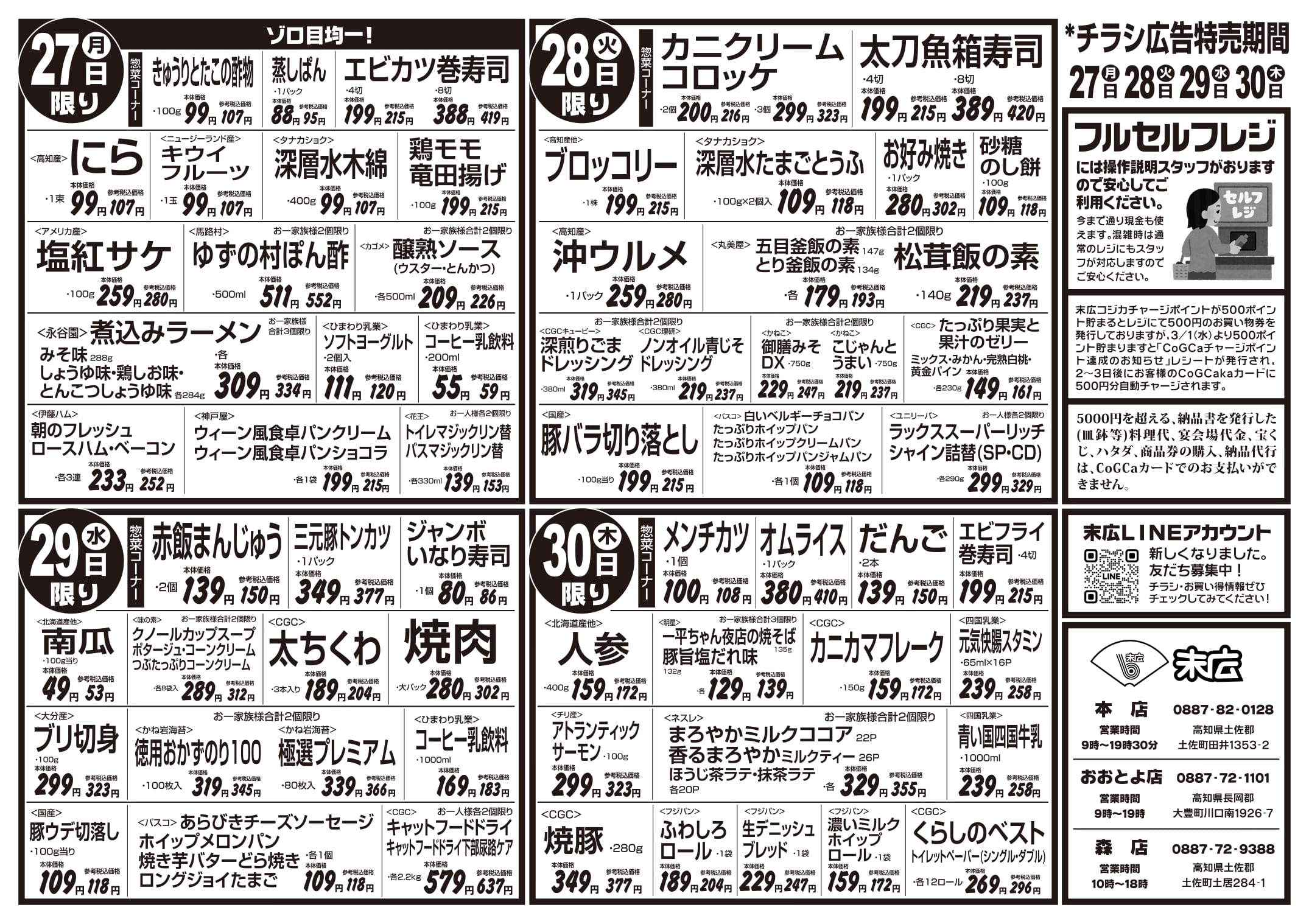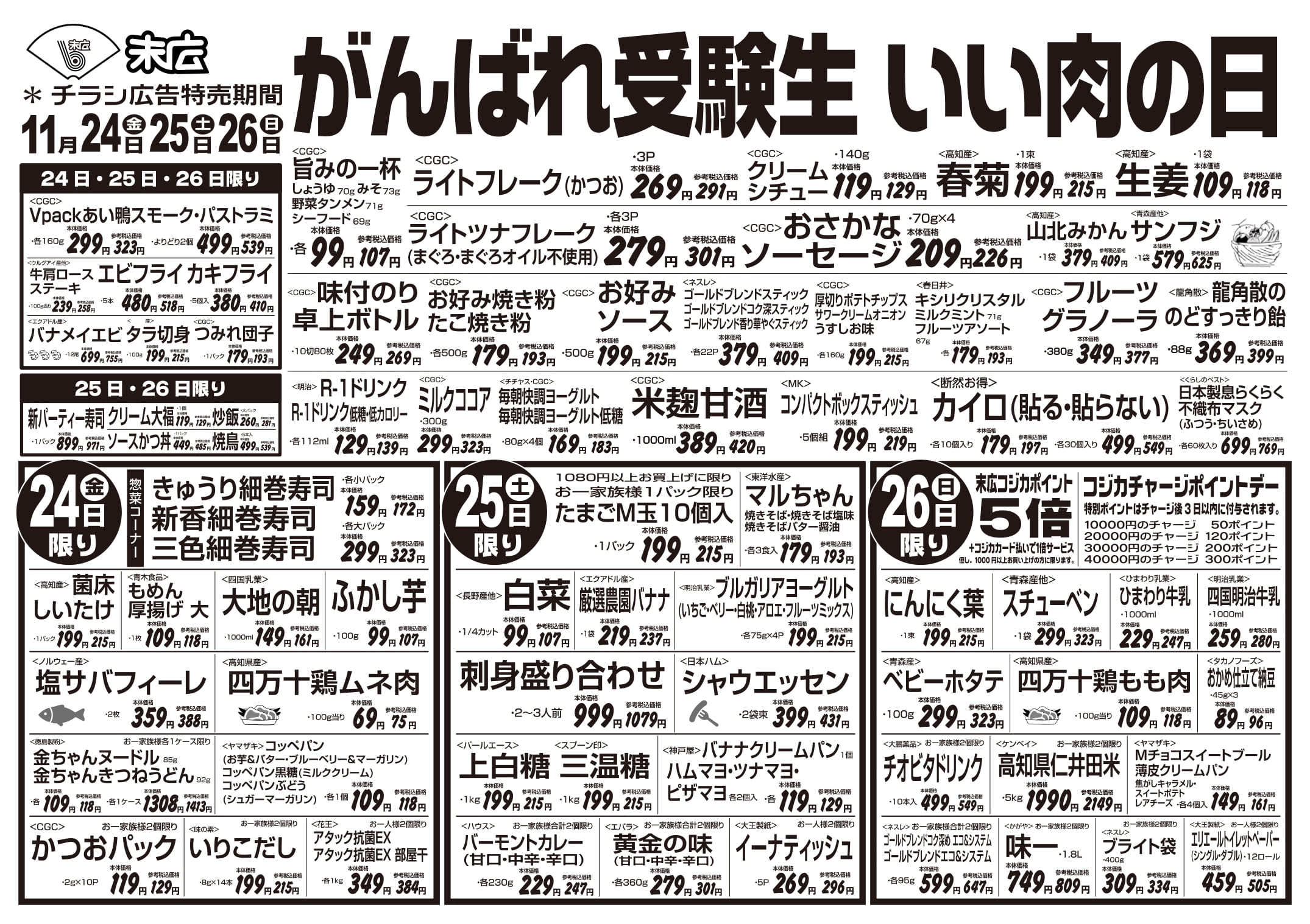 【末広チラシ情報】ネットでチラシを確認できます。 11月24日~11月30日のチラシは「がんばれ受験生 新パーティー寿司 971円」 詳細版PDFはこちら(1.4MB) チラシ情報 この記事が気に入ったら いいね または フォローしてね! Follow @suehiloya Follow Me よかったらシェアしてね! URLをコピーしました! URLをコピーしました! 11月17日~11月23日のチラシは「お肉のジャンボ市! よりどり3パック 1080円」 12月1日~12月7日のチラシは「歳末総力祭 アトランティックサーモン 323円」 関連記事 10月24日~10月30日のチラシは「おうちでハロウィンしよ サーモン刺身用 388円」 2025年10月23日 10月17日~10月23日のチラシは「秋の土用スタミナメニュー 生さんま 626円」 2025年10月16日 高知新聞で「田舎寿司せっと」が紹介されました! 2025年10月16日 9月5日~9月11日のチラシは「秋のうまかもん祭り 本マグロ刺身用 755円」 2025年9月4日 8月29日~9月4日のチラシは「家計応援! 総力祭 トラウトサーモン 215円」 2025年8月28日 8月22日~8月28日のチラシは「初秋の味わい・秋の新商品 生さんま1尾 215円」 2025年8月21日 8月15日~8月21日のチラシは「夏のスタミナ飯特集 北海道産 無添加ほっけ開き 410円」 2025年8月14日 仕出しのメニューを更新しました。(2025年8月) 2025年8月8日