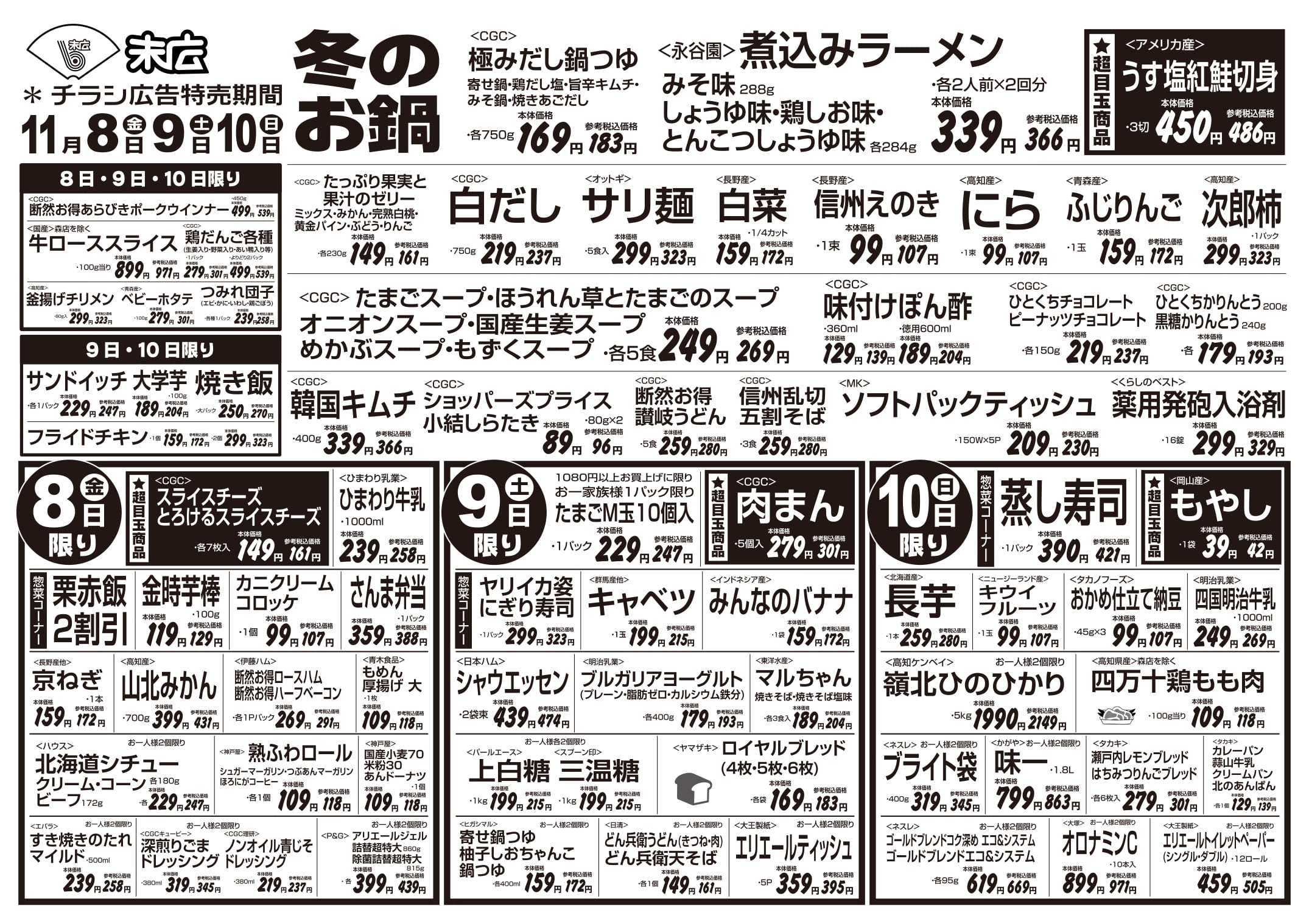 【末広チラシ情報】ネットでチラシを確認できます。 11月8日~11月14日のチラシは「冬のお鍋 うす塩鮭切身 486円」 詳細版PDFはこちら(1.5MB) チラシ情報 この記事が気に入ったら いいね または フォローしてね! Follow @suehiloya Follow Me よかったらシェアしてね! URLをコピーしました! URLをコピーしました! 11月1日~11月7日のチラシは「月初めの市 北海道産 玉ねぎ 107円」 11月15日~11月21日のチラシは「ワインと愉しむ洋食メニュー サーモン刺身用 388円」 関連記事 10月24日~10月30日のチラシは「おうちでハロウィンしよ サーモン刺身用 388円」 2025年10月23日 10月17日~10月23日のチラシは「秋の土用スタミナメニュー 生さんま 626円」 2025年10月16日 高知新聞で「田舎寿司せっと」が紹介されました! 2025年10月16日 9月5日~9月11日のチラシは「秋のうまかもん祭り 本マグロ刺身用 755円」 2025年9月4日 8月29日~9月4日のチラシは「家計応援! 総力祭 トラウトサーモン 215円」 2025年8月28日 8月22日~8月28日のチラシは「初秋の味わい・秋の新商品 生さんま1尾 215円」 2025年8月21日 8月15日~8月21日のチラシは「夏のスタミナ飯特集 北海道産 無添加ほっけ開き 410円」 2025年8月14日 仕出しのメニューを更新しました。(2025年8月) 2025年8月8日