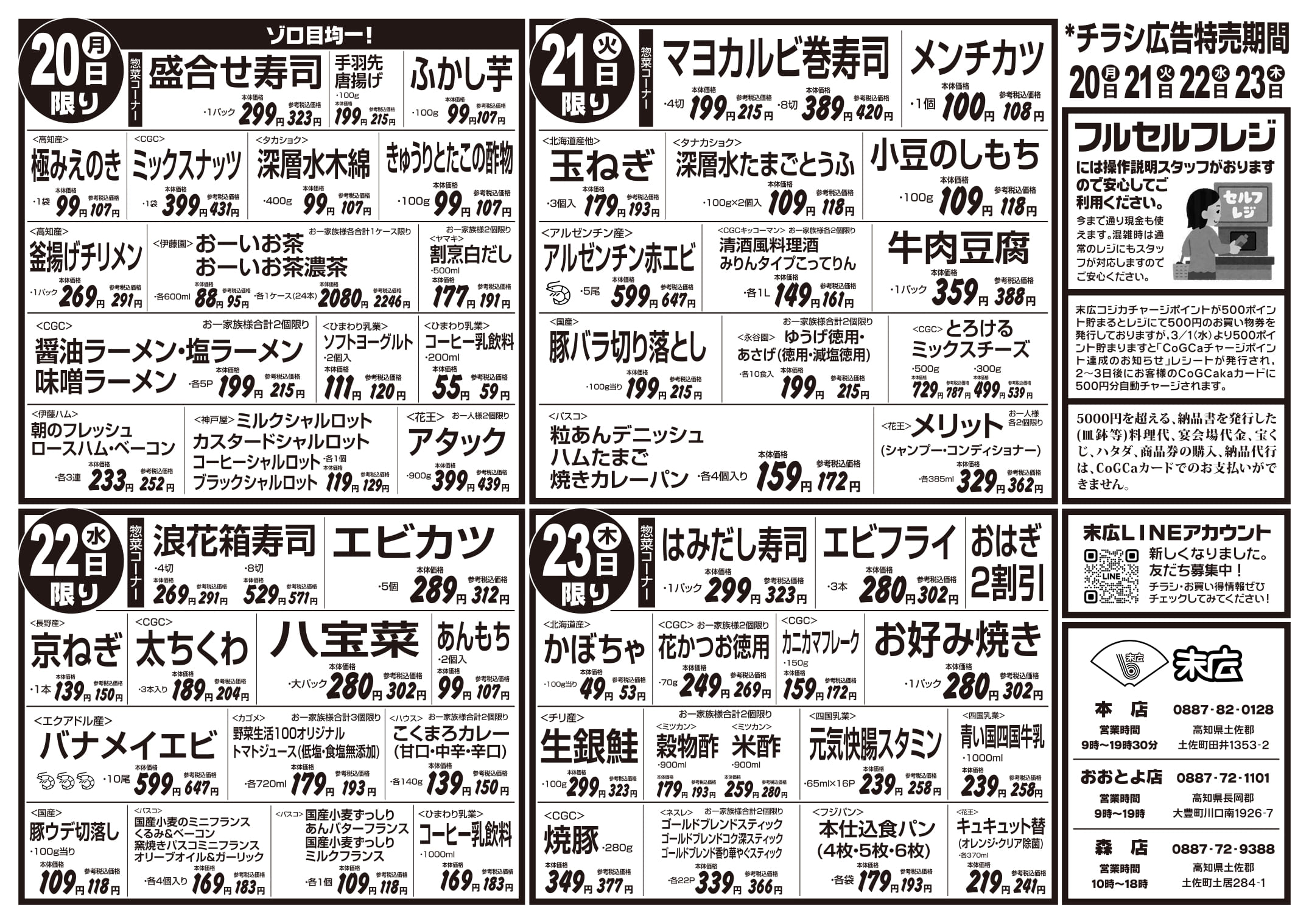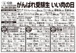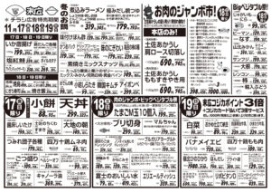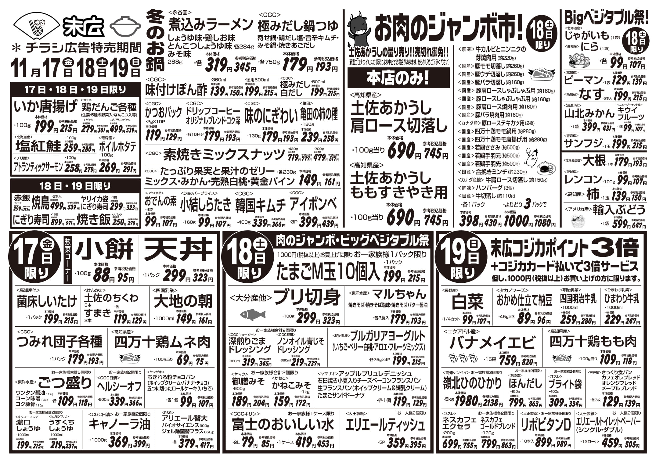【末広チラシ情報】ネットでチラシを確認できます。 11月17日~11月23日のチラシは「お肉のジャンボ市! よりどり3パック 1080円」 詳細版PDFはこちら(1.5MB) チラシ情報 この記事が気に入ったら いいね または フォローしてね! Follow @suehiloya Follow Me よかったらシェアしてね! URLをコピーしました! URLをコピーしました! 11月10日~11月16日のチラシは「ワインと愉しむ洋食メニュー 牛肩ロースステーキ 239円」 11月24日~11月30日のチラシは「がんばれ受験生 新パーティー寿司 971円」 関連記事 10月17日~10月23日のチラシは「秋の土用スタミナメニュー 生さんま 626円」 2025年10月16日 高知新聞で「田舎寿司せっと」が紹介されました! 2025年10月16日 9月5日~9月11日のチラシは「秋のうまかもん祭り 本マグロ刺身用 755円」 2025年9月4日 8月29日~9月4日のチラシは「家計応援! 総力祭 トラウトサーモン 215円」 2025年8月28日 8月22日~8月28日のチラシは「初秋の味わい・秋の新商品 生さんま1尾 215円」 2025年8月21日 8月15日~8月21日のチラシは「夏のスタミナ飯特集 北海道産 無添加ほっけ開き 410円」 2025年8月14日 仕出しのメニューを更新しました。(2025年8月) 2025年8月8日 8月8日~8月14日のチラシは「お盆のごちそう 海鮮BBQセット 863円」 2025年8月7日