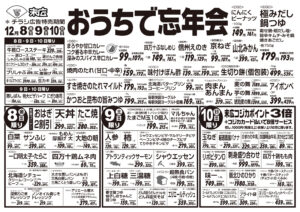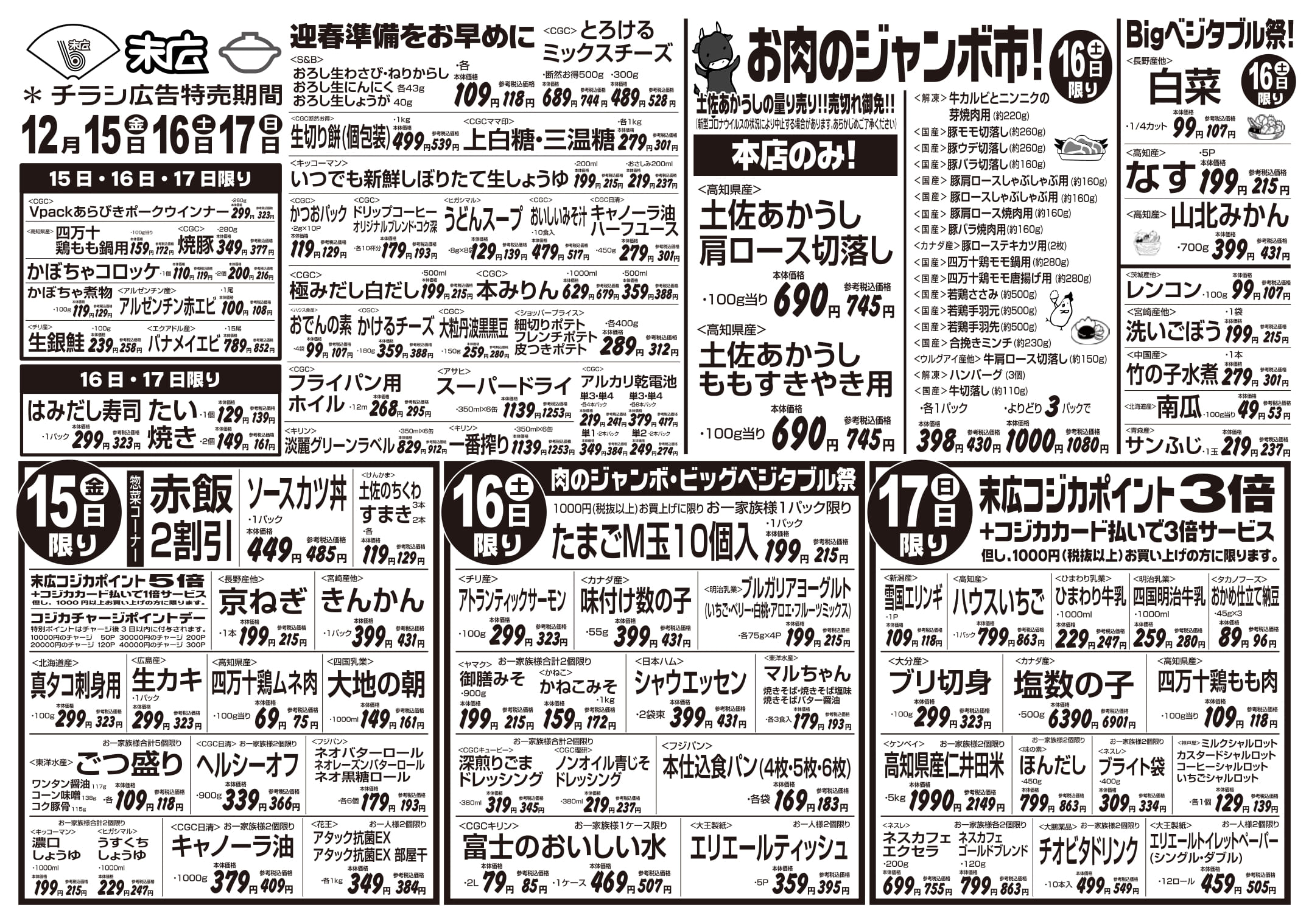 【末広チラシ情報】ネットでチラシを確認できます。 12月15日~12月21日のチラシは「迎春準備をお早めに アルゼンチン赤エビ 108円」 詳細版PDFはこちら(1.6MB) チラシ情報 この記事が気に入ったら いいね または フォローしてね! Follow @suehiloya Follow Me よかったらシェアしてね! URLをコピーしました! URLをコピーしました! 12月8日~12月14日のチラシは「おうちで忘年会 ブリしゃぶ 755円」 年内配送終了のお知らせ 関連記事 10月17日~10月23日のチラシは「秋の土用スタミナメニュー 生さんま 626円」 2025年10月16日 高知新聞で「田舎寿司せっと」が紹介されました! 2025年10月16日 9月5日~9月11日のチラシは「秋のうまかもん祭り 本マグロ刺身用 755円」 2025年9月4日 8月29日~9月4日のチラシは「家計応援! 総力祭 トラウトサーモン 215円」 2025年8月28日 8月22日~8月28日のチラシは「初秋の味わい・秋の新商品 生さんま1尾 215円」 2025年8月21日 8月15日~8月21日のチラシは「夏のスタミナ飯特集 北海道産 無添加ほっけ開き 410円」 2025年8月14日 仕出しのメニューを更新しました。(2025年8月) 2025年8月8日 8月8日~8月14日のチラシは「お盆のごちそう 海鮮BBQセット 863円」 2025年8月7日