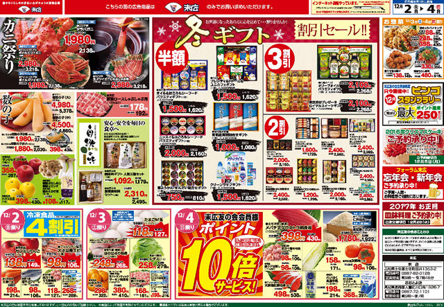 12月2日から12月4日のチラシは「冬ギフト割引セール。オイル&はごろもシーフードバラエティーギフト半額1,500円」