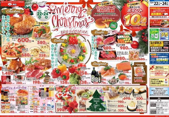12月22日から12月24日のチラシは「Merry Christmas!食卓を盛り上げる主役のチキン!四万十鶏ローストレッグ600円」