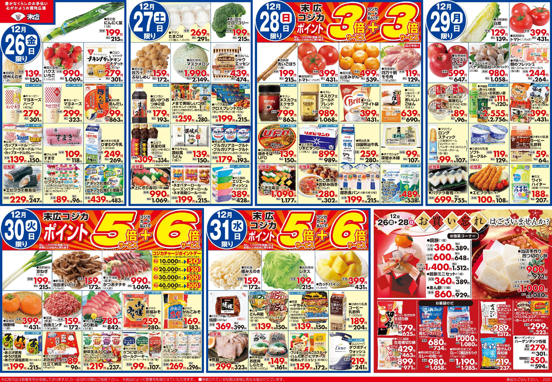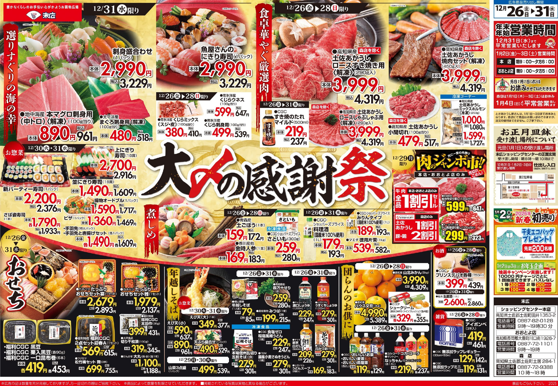 【末広チラシ情報】ネットでチラシを確認できます。 12月26日~12月31日のチラシは「大〆の感謝祭 本マグロ刺身用(中トロ) 961 円」 詳細版PDFはこちら(2.0MB) チラシ情報 この記事が気に入ったら いいね または フォローしてね! Follow @suehiloya Follow Me よかったらシェアしてね! URLをコピーしました! URLをコピーしました! 12月19日~12月25日のチラシは「ファミリークリスマス 四万十産ローストレッグ 755 円」 関連記事 12月19日~12月25日のチラシは「ファミリークリスマス 四万十産ローストレッグ 755 円」 2025年12月18日 高知新聞折り込み冊子「ミリカ」に掲載されました 2025年12月17日 12月12日~12月18日のチラシは「あったかおうち鍋 大分産ぶり切身 431 円」 2025年12月11日 12月5日~12月11日のチラシは「おうち忘年会 大分産ぶりしゃぶしゃぶ用 842 円」 2025年12月4日 11月28日~12月4日のチラシは「歳末大感謝祭! 牛肩ロースすき焼き用 323 円」 2025年11月27日 11月21日~11月27日のチラシは「ごち鍋まつり 生カキ(加熱用) 388 円」 2025年11月20日 2026年初春お正月おせち・皿鉢料理の予約受付開始いたしました。 2025年11月19日 11月14日~11月20日のチラシは「ワインバルmenu バナメイエビ(ジャンボパック) 626 円」 2025年11月13日