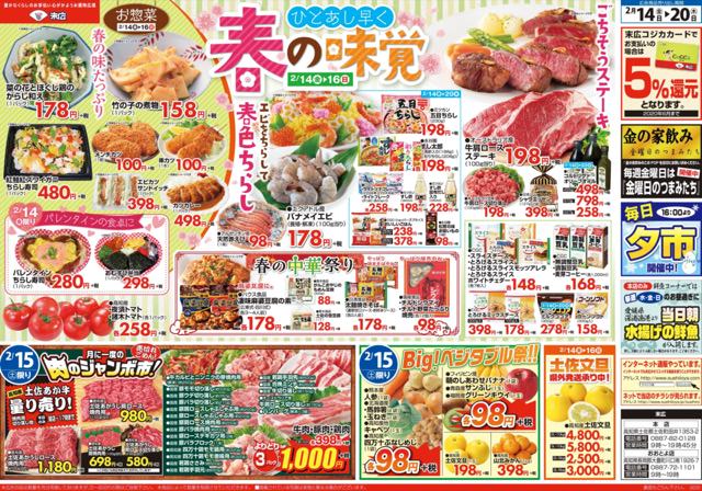 2月14日から2月20日のチラシは「ひとあし早く春の味覚。竹の子の煮物158円」