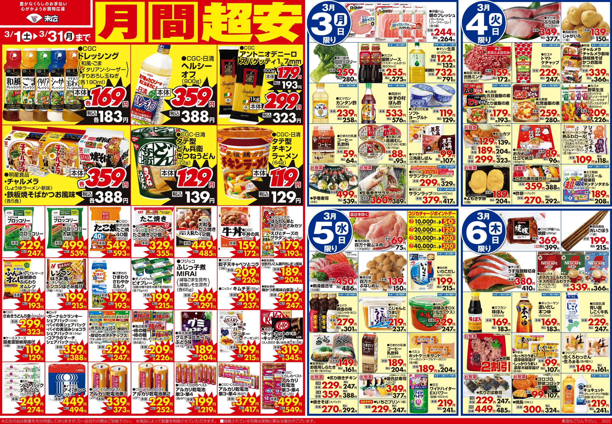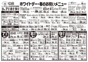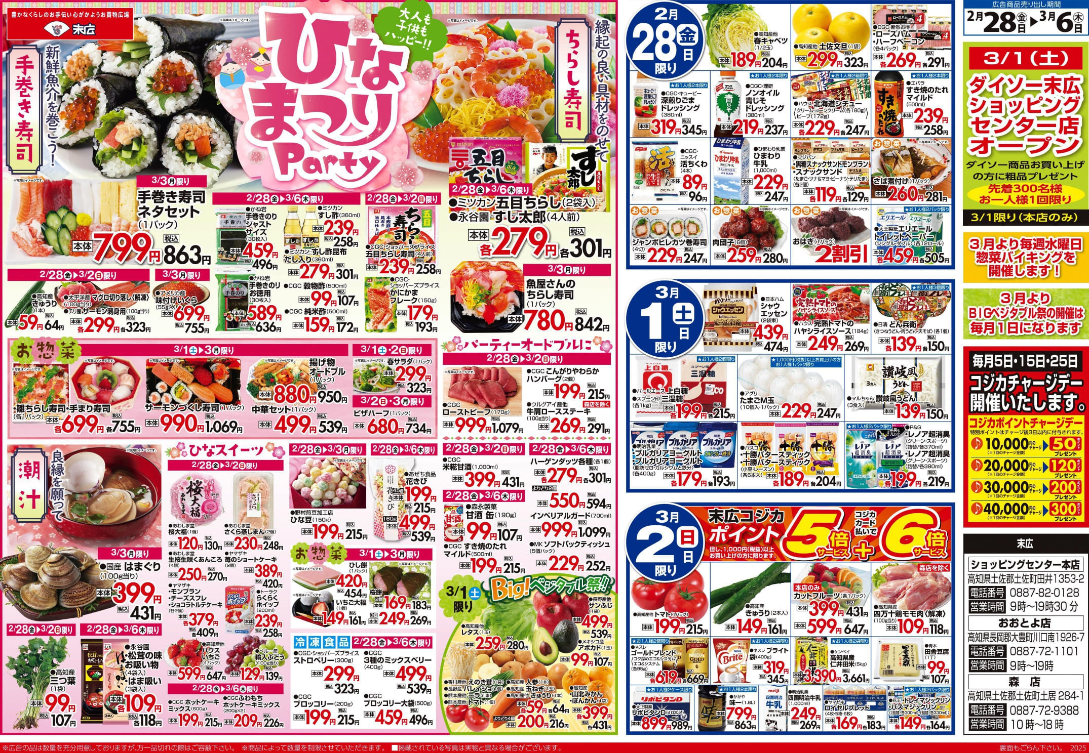 【末広チラシ情報】ネットでチラシを確認できます。 2月28日~3月6日のチラシは「ひなまつりParty 手巻き寿司ネタセット 863円」 詳細版PDFはこちら(1.5MB) チラシ情報 この記事が気に入ったら いいね または フォローしてね! Follow @suehiloya Follow Me よかったらシェアしてね! URLをコピーしました! URLをコピーしました! 2月21日~2月27日のチラシは「春の味覚 桜餅 269円」 3月7日~3月13日のチラシは「ホワイトデー・春のお祝いメニュー 牛肩ロースステーキ 291円」 関連記事 10月17日~10月23日のチラシは「秋の土用スタミナメニュー 生さんま 626円」 2025年10月16日 高知新聞で「田舎寿司せっと」が紹介されました! 2025年10月16日 9月5日~9月11日のチラシは「秋のうまかもん祭り 本マグロ刺身用 755円」 2025年9月4日 8月29日~9月4日のチラシは「家計応援! 総力祭 トラウトサーモン 215円」 2025年8月28日 8月22日~8月28日のチラシは「初秋の味わい・秋の新商品 生さんま1尾 215円」 2025年8月21日 8月15日~8月21日のチラシは「夏のスタミナ飯特集 北海道産 無添加ほっけ開き 410円」 2025年8月14日 仕出しのメニューを更新しました。(2025年8月) 2025年8月8日 8月8日~8月14日のチラシは「お盆のごちそう 海鮮BBQセット 863円」 2025年8月7日
