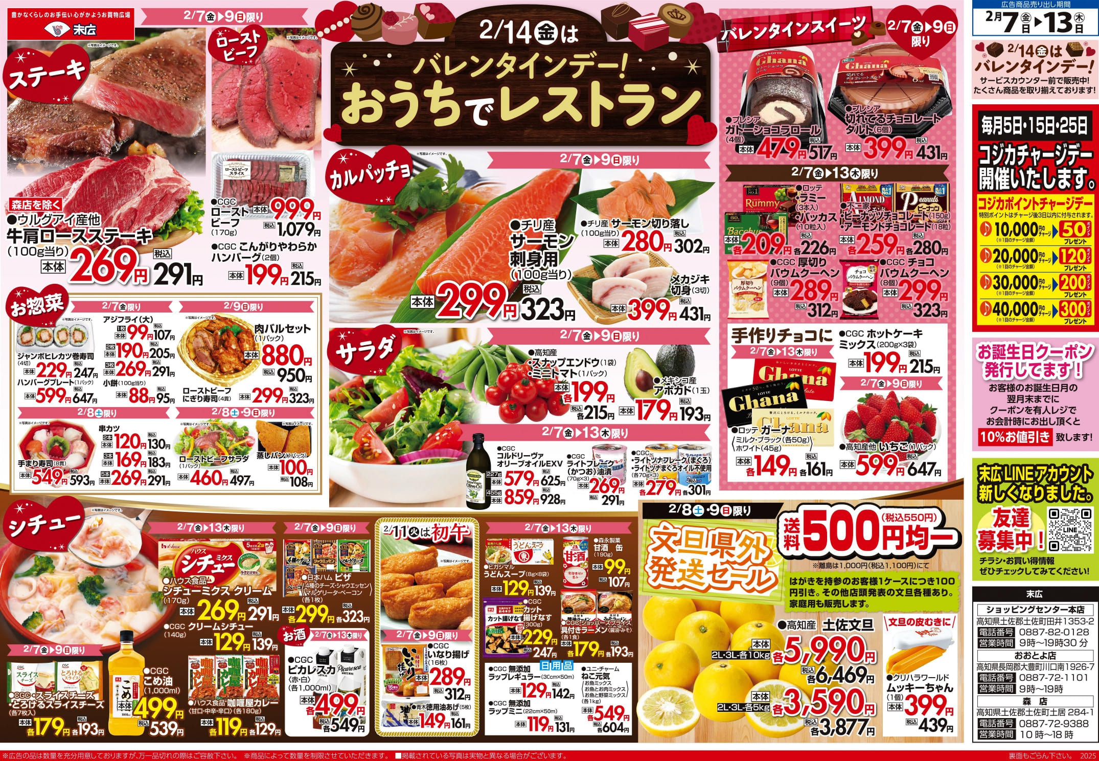 【末広チラシ情報】ネットでチラシを確認できます。 2月7日~2月13日のチラシは「2/14はバレンタインデー! サーモン刺身用 323円」 詳細版PDFはこちら(1.5MB) チラシ情報 この記事が気に入ったら いいね または フォローしてね! Follow @suehiloya Follow Me よかったらシェアしてね! URLをコピーしました! URLをコピーしました! 1月31日~2月6日のチラシは「2/2は節分 手巻き寿司ネタセット 863円」 2月14日~2月20日のチラシは「春を先取り・春中華 広島産 生カキ(加熱用) 302円」 関連記事 10月17日~10月23日のチラシは「秋の土用スタミナメニュー 生さんま 626円」 2025年10月16日 高知新聞で「田舎寿司せっと」が紹介されました! 2025年10月16日 9月5日~9月11日のチラシは「秋のうまかもん祭り 本マグロ刺身用 755円」 2025年9月4日 8月29日~9月4日のチラシは「家計応援! 総力祭 トラウトサーモン 215円」 2025年8月28日 8月22日~8月28日のチラシは「初秋の味わい・秋の新商品 生さんま1尾 215円」 2025年8月21日 8月15日~8月21日のチラシは「夏のスタミナ飯特集 北海道産 無添加ほっけ開き 410円」 2025年8月14日 仕出しのメニューを更新しました。(2025年8月) 2025年8月8日 8月8日~8月14日のチラシは「お盆のごちそう 海鮮BBQセット 863円」 2025年8月7日