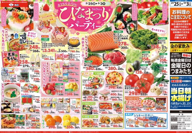 2月25日から3月3日のチラシは「おうちで手作り!ひなまつりパーティー。ひなまつり生クリーム5号3,500円」