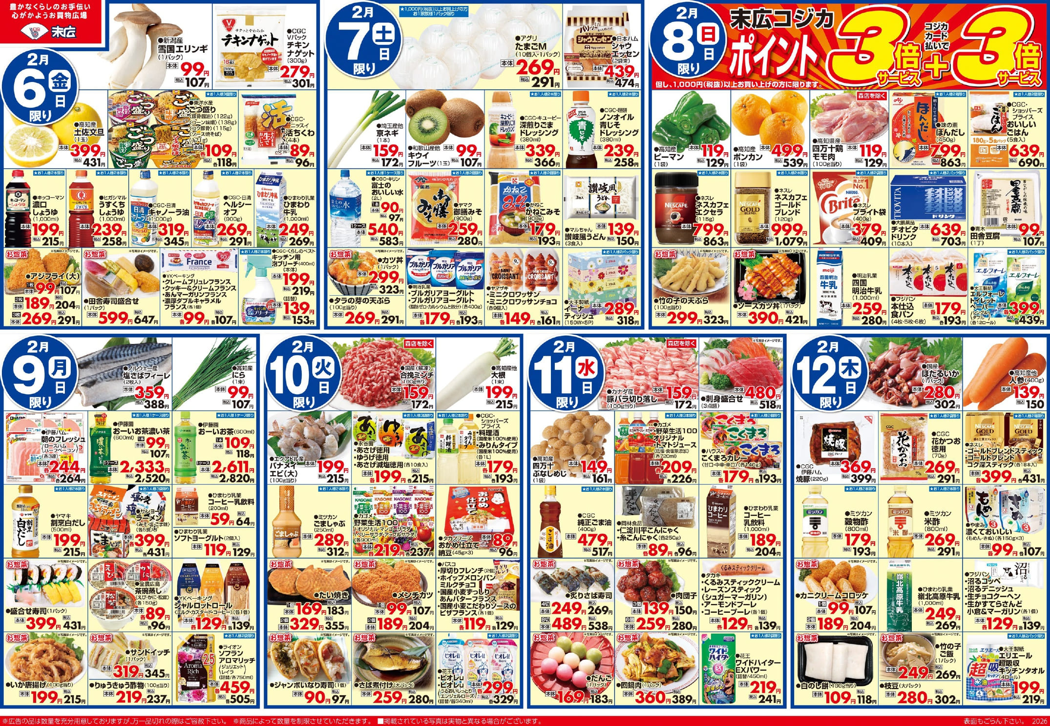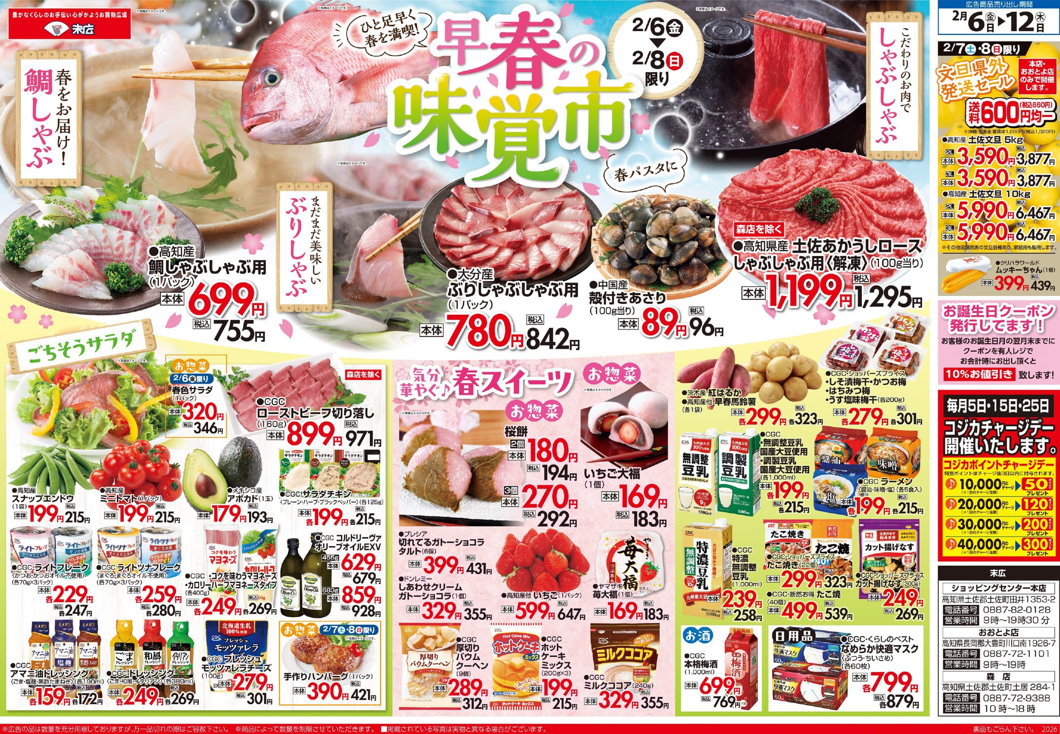 【末広チラシ情報】ネットでチラシを確認できます。 2月6日~2月16日のチラシは「早春の味覚市 鯛しゃぶしゃぶ用 755円」 詳細版PDFはこちら(1.0MB) チラシ情報 この記事が気に入ったら いいね または フォローしてね! Follow @suehiloya Follow Me よかったらシェアしてね! URLをコピーしました! URLをコピーしました! 1月30日~2月5日のチラシは「2月3日は節分 手巻き寿司ネタセット 863円」 関連記事 1月30日~2月5日のチラシは「2月3日は節分 手巻き寿司ネタセット 863円」 2026年1月29日 1月16日~1月22日のチラシは「寒魚&大寒鍋特集 ブリしゃぶしゃぶ用 842 円」 2026年1月15日 1月9日~1月15日のチラシは「トンカツ大作戦 豚ロースとんかつ用 161 円」 2026年1月8日 1月4日~1月8日のチラシは「春の七草 愛媛県産 七草(1パック) 539 円」 2026年1月3日 1月2日~1月3日のチラシは「新春初売り 刺身盛合わせ 2,149 円」 2026年1月1日 12月26日~12月31日のチラシは「大〆の感謝祭 本マグロ刺身用(中トロ) 961 円」 2025年12月25日 12月19日~12月25日のチラシは「ファミリークリスマス 四万十産ローストレッグ 755 円」 2025年12月18日 高知新聞折り込み冊子「ミリカ」に掲載されました 2025年12月17日