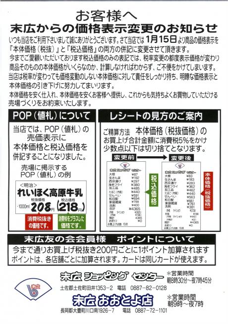 1月15日より商品価格の表示を、本体価格+税込み価格の併記とさせて頂きます。