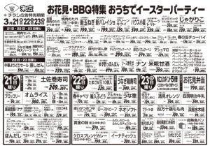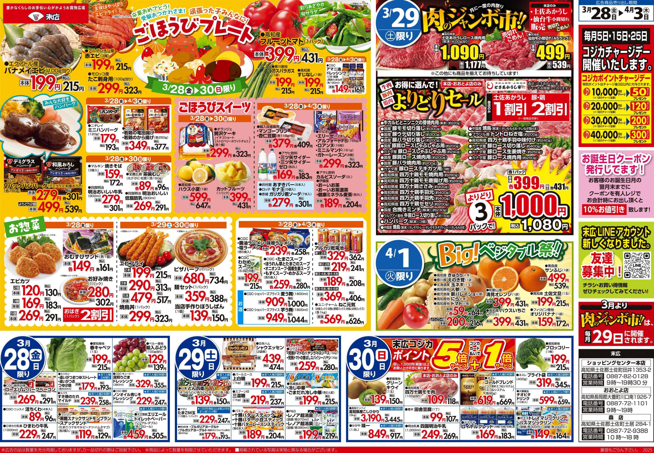 【末広チラシ情報】ネットでチラシを確認できます。 3月28日~4月3日のチラシは「ごほうびプレート バナメイエビ(100g) 215円」 詳細版PDFはこちら(1.5MB) チラシ情報 この記事が気に入ったら いいね または フォローしてね! Follow @suehiloya Follow Me よかったらシェアしてね! URLをコピーしました! URLをコピーしました! 3月21日~3月27日のチラシは「お花見・BBQ特集 おうちでイースターパーティー うなぎ蒲焼特大ハーフ 961円」 食品トレーのリサイクル推進に関するニュースが紹介されました 関連記事 10月17日~10月23日のチラシは「秋の土用スタミナメニュー 生さんま 626円」 2025年10月16日 高知新聞で「田舎寿司せっと」が紹介されました! 2025年10月16日 9月5日~9月11日のチラシは「秋のうまかもん祭り 本マグロ刺身用 755円」 2025年9月4日 8月29日~9月4日のチラシは「家計応援! 総力祭 トラウトサーモン 215円」 2025年8月28日 8月22日~8月28日のチラシは「初秋の味わい・秋の新商品 生さんま1尾 215円」 2025年8月21日 8月15日~8月21日のチラシは「夏のスタミナ飯特集 北海道産 無添加ほっけ開き 410円」 2025年8月14日 仕出しのメニューを更新しました。(2025年8月) 2025年8月8日 8月8日~8月14日のチラシは「お盆のごちそう 海鮮BBQセット 863円」 2025年8月7日