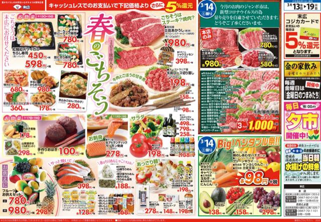 3月13日から3月19日のチラシは「3月17日は彼岸の入り。春のごちそう。新パーティー寿司780円」