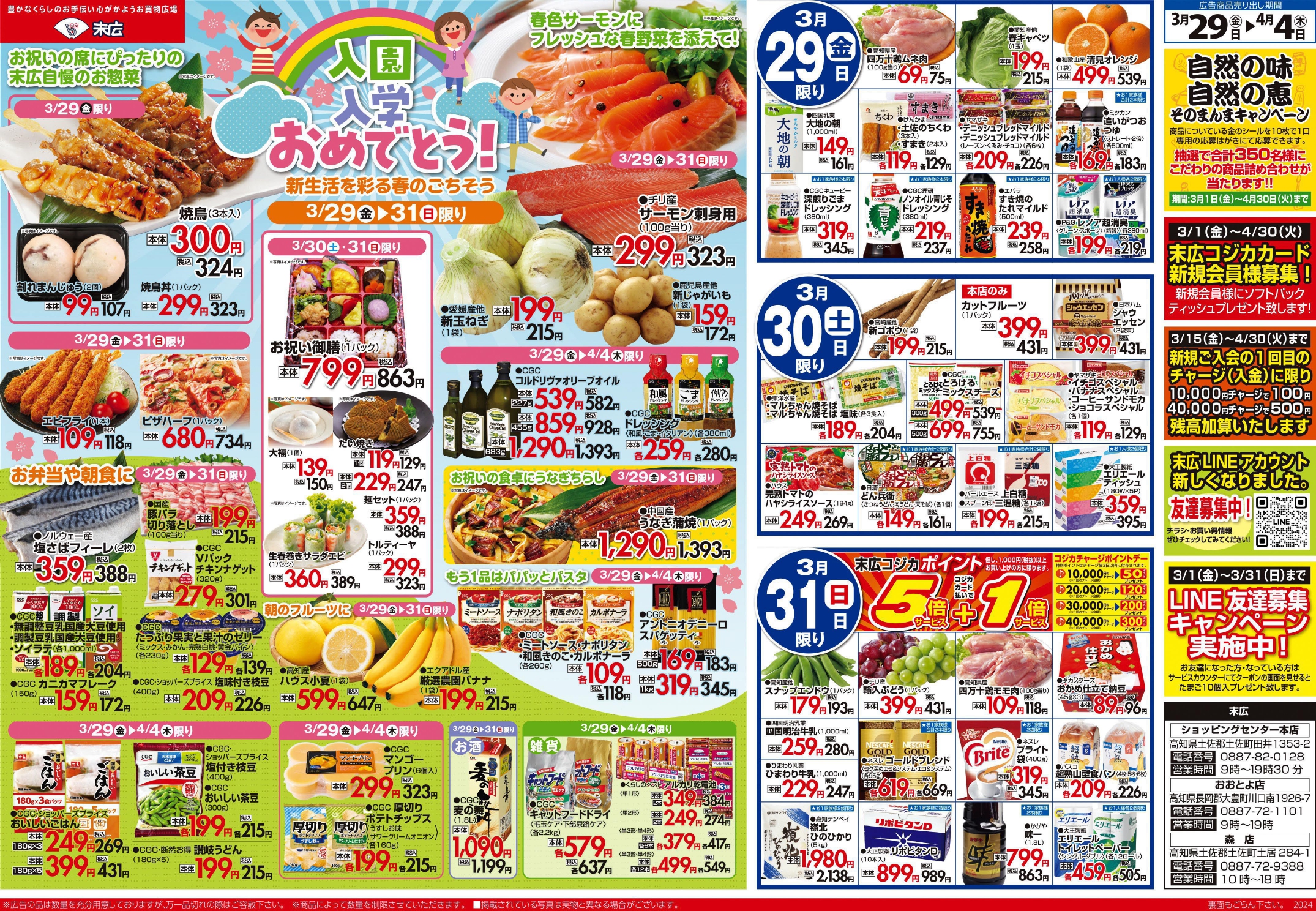 【末広チラシ情報】ネットでチラシを確認できます。 3月29日~4月4日のチラシは「新生活を彩る春のごちそう サーモン刺身用 323円」 詳細版PDFはこちら(1.6MB) チラシ情報 この記事が気に入ったら いいね または フォローしてね! Follow @suehiloya Follow Me よかったらシェアしてね! URLをコピーしました! URLをコピーしました! 3月22日~3月28日のチラシは「お花見特集・行楽セール うなぎ蒲焼 2149円」 4月5日~4月11日のチラシは「新生活応援セール まぐろ刺身用 518円」 関連記事 10月31日~11月6日のチラシは「月初めの市 バナメイエビ 215円」 2025年10月30日 株式会社末広のHPがリニューアルしました 2025年10月30日 10月24日~10月30日のチラシは「おうちでハロウィンしよ サーモン刺身用 388円」 2025年10月23日 10月17日~10月23日のチラシは「秋の土用スタミナメニュー 生さんま 626円」 2025年10月16日 高知新聞で「田舎寿司せっと」が紹介されました! 2025年10月16日 9月5日~9月11日のチラシは「秋のうまかもん祭り 本マグロ刺身用 755円」 2025年9月4日 8月29日~9月4日のチラシは「家計応援! 総力祭 トラウトサーモン 215円」 2025年8月28日 8月22日~8月28日のチラシは「初秋の味わい・秋の新商品 生さんま1尾 215円」 2025年8月21日