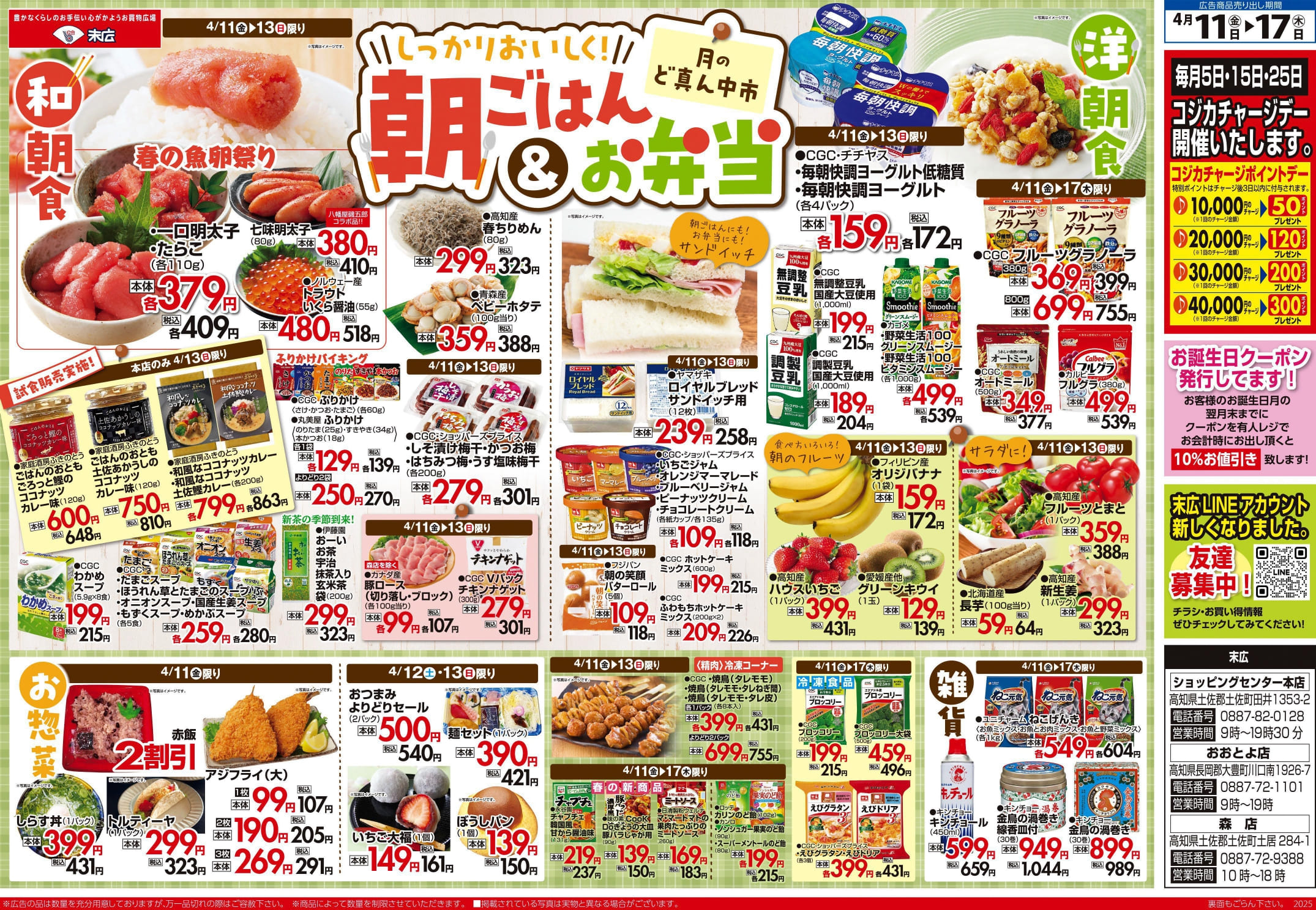 【末広チラシ情報】ネットでチラシを確認できます。 4月11日~4月17日のチラシは「しっかりおいしく!朝ごはん&お弁当 一口明太子 409円」 詳細版PDFはこちら(1.5MB) チラシ情報 この記事が気に入ったら いいね または フォローしてね! Follow @suehiloya Follow Me よかったらシェアしてね! URLをコピーしました! URLをコピーしました! 4月4日~4月10日のチラシは「春のお祝い御前 手巻き寿司ねたセット 863円」 4月18日~4月24日のチラシは「新入学応援セール サーモン切落し 323円」 関連記事 10月24日~10月30日のチラシは「おうちでハロウィンしよ サーモン刺身用 388円」 2025年10月23日 10月17日~10月23日のチラシは「秋の土用スタミナメニュー 生さんま 626円」 2025年10月16日 高知新聞で「田舎寿司せっと」が紹介されました! 2025年10月16日 9月5日~9月11日のチラシは「秋のうまかもん祭り 本マグロ刺身用 755円」 2025年9月4日 8月29日~9月4日のチラシは「家計応援! 総力祭 トラウトサーモン 215円」 2025年8月28日 8月22日~8月28日のチラシは「初秋の味わい・秋の新商品 生さんま1尾 215円」 2025年8月21日 8月15日~8月21日のチラシは「夏のスタミナ飯特集 北海道産 無添加ほっけ開き 410円」 2025年8月14日 仕出しのメニューを更新しました。(2025年8月) 2025年8月8日