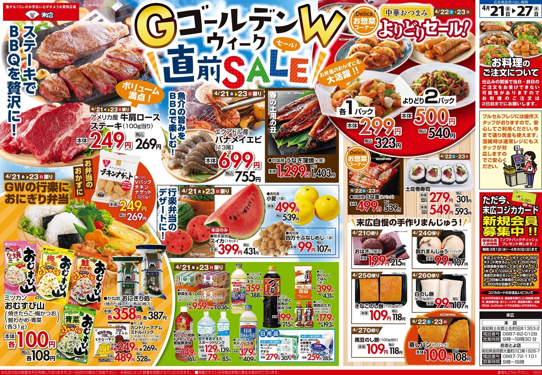 4月21日~4月23日のチラシは「ゴールデンウィーク直前セール!牛肩ロースステーキ269円」