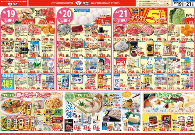 4月19日から4月21日のチラシは「爽やかな春の食卓。かつおタタキ268円」