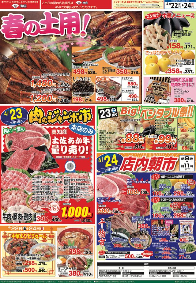 4月22日から4月24日のチラシは「春の土用!高知産うなぎ蒲焼1,480円」