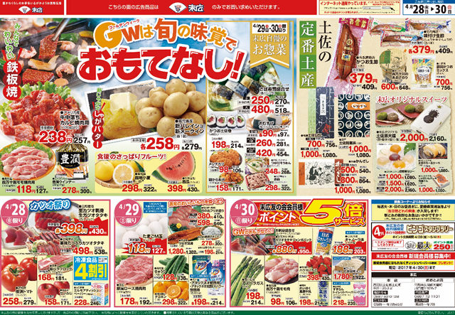 4月28日から4月30日のチラシは「GWは旬の味覚でおもてなし。カルビ焼肉用238円」