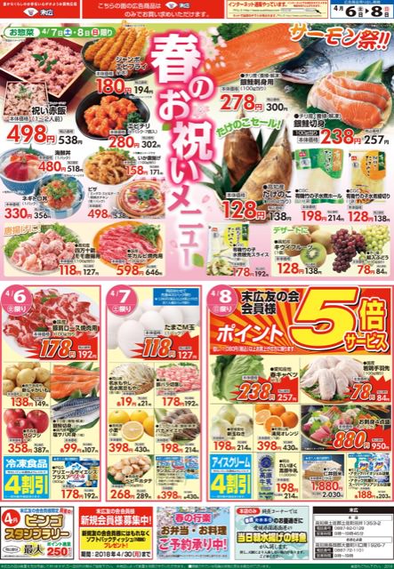 4月6日から4月8日のチラシは「春のお祝いメニュー。ジャンボエビフライ180円」